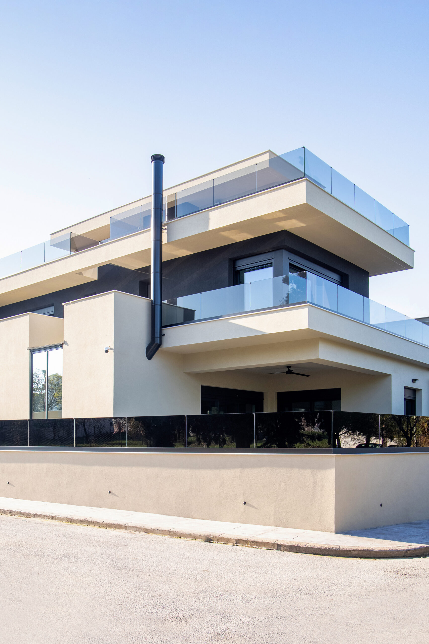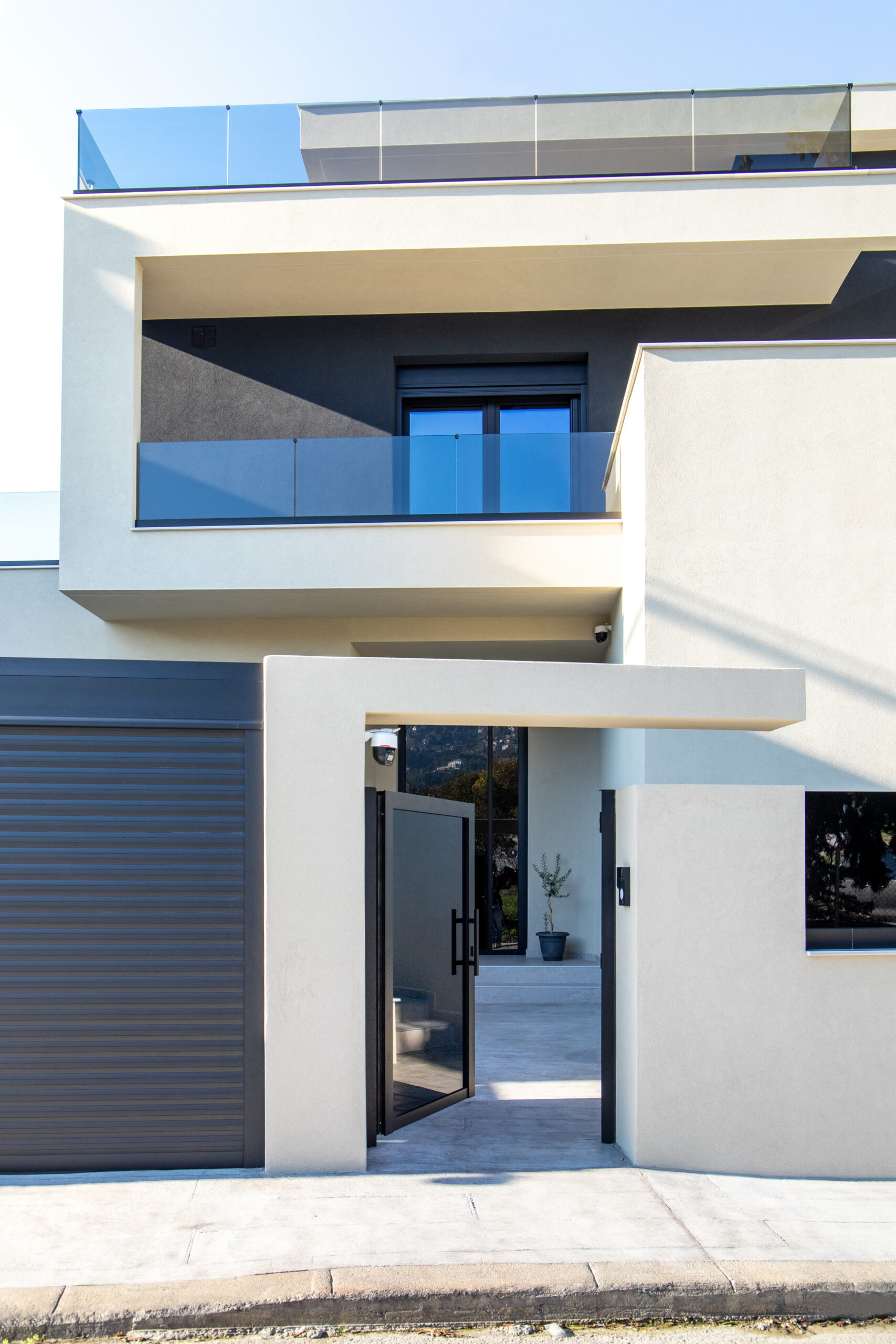 Για την κατοικία επιλέχθηκαν κουφώματα ARTEVO της REHAU, με ινοενισχυμένη τεχνολογία (fiber-glassreinforced), σε συνδυασμό με διάτρητα ρολά βαρέως τύπου που προσφέρουν υψηλή ασφάλεια, θερμομονωτικές ιδιότητες, αισθητική και λειτουργικότητα.Τοcustom γωνιακό υαλοπέτασμα του ισογείου, με θέα προς τον ουρανό, γεμίζει το εσωτερικό με φυσικό φως και δημιουργεί μια αίσθηση συνεχούς επαφής με το εξωτερικό περιβάλλον.