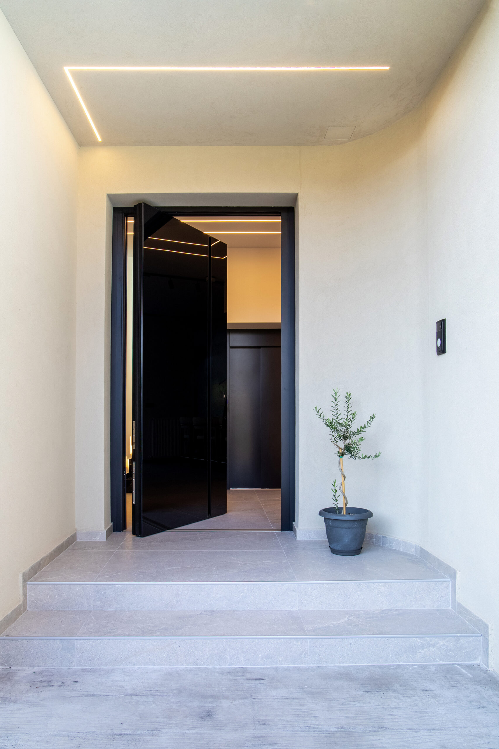 Η κεντρική πόρτα αποτελεί ένα από τα πιο εμβληματικά στοιχεία του έργου. Πρόκειται για αξονική pivot πόρτα ύψους 3,00 μ., με επένδυση από γυαλί ασφαλείας 10 mm εσωτερικά και εξωτερικά. Η παρουσία της είναι επιβλητική και ταυτόχρονα μινιμαλιστική, ενώ η τεχνολογία pivot προσφέρει άψογη λειτουργία και υψηλή αίσθηση ασφάλειας. Πρόκειται για μια επιλογή υψηλού κόστους που ενισχύει την αίσθηση πολυτέλειας και αρχιτεκτονικού κύρους.