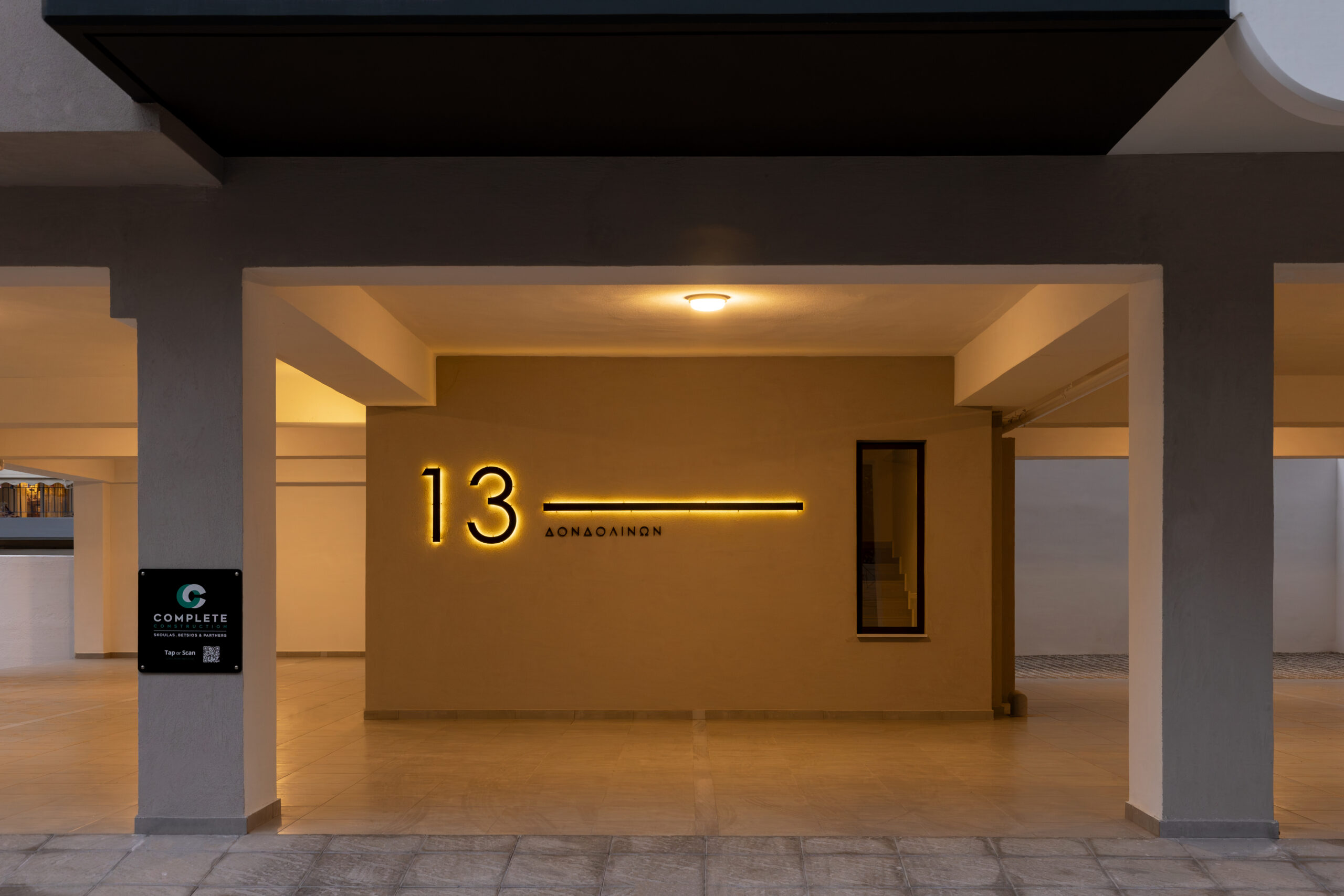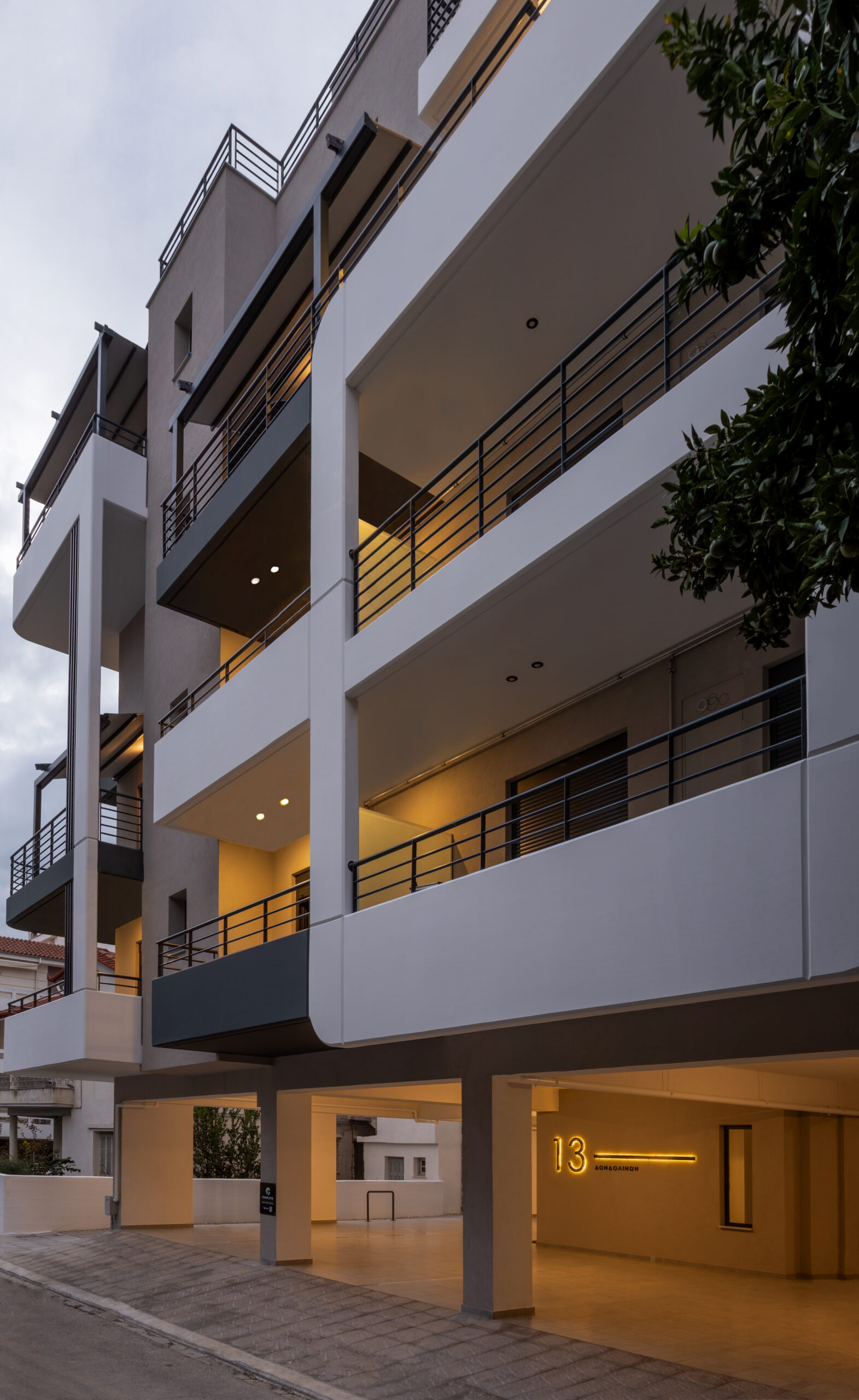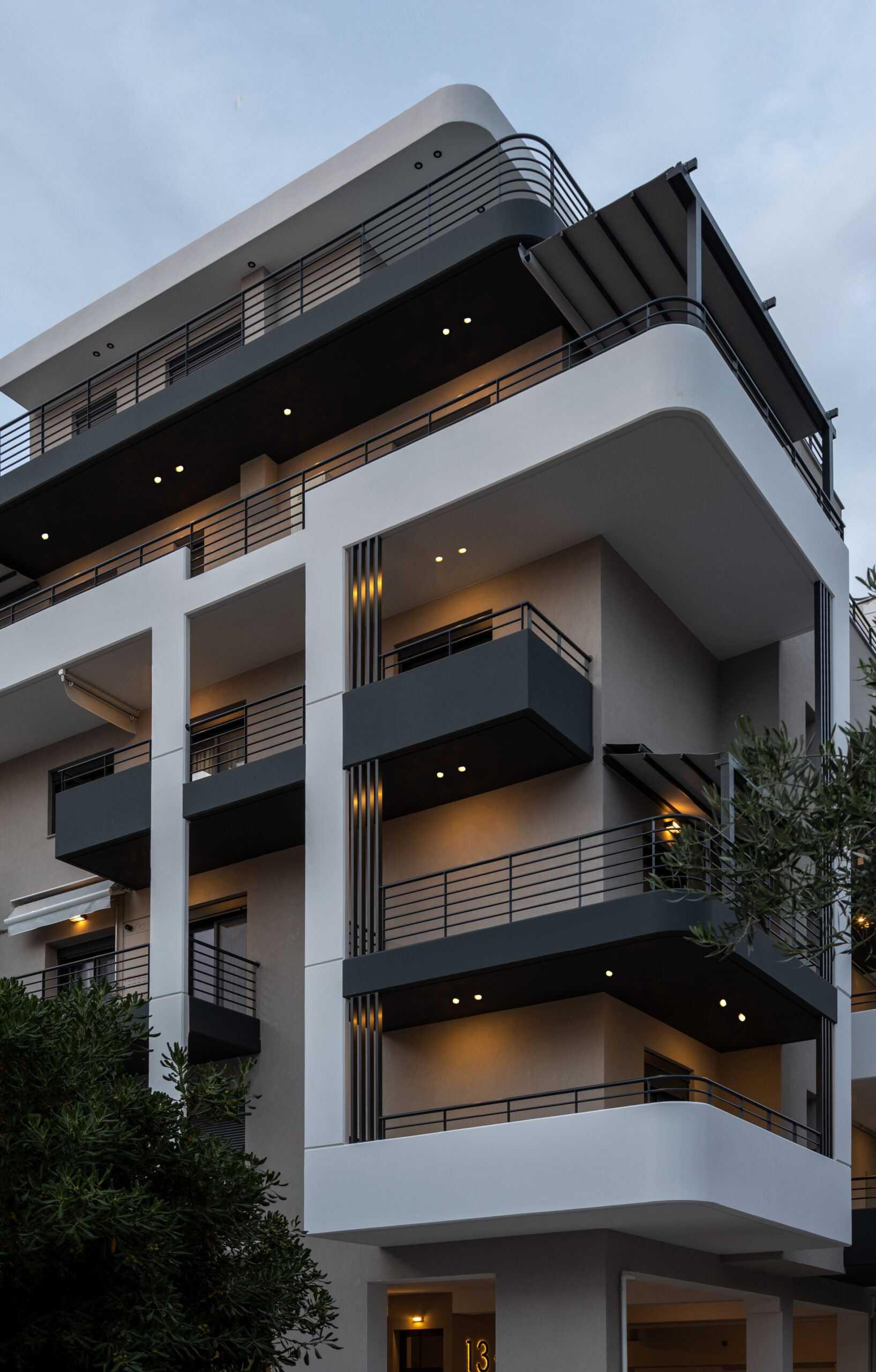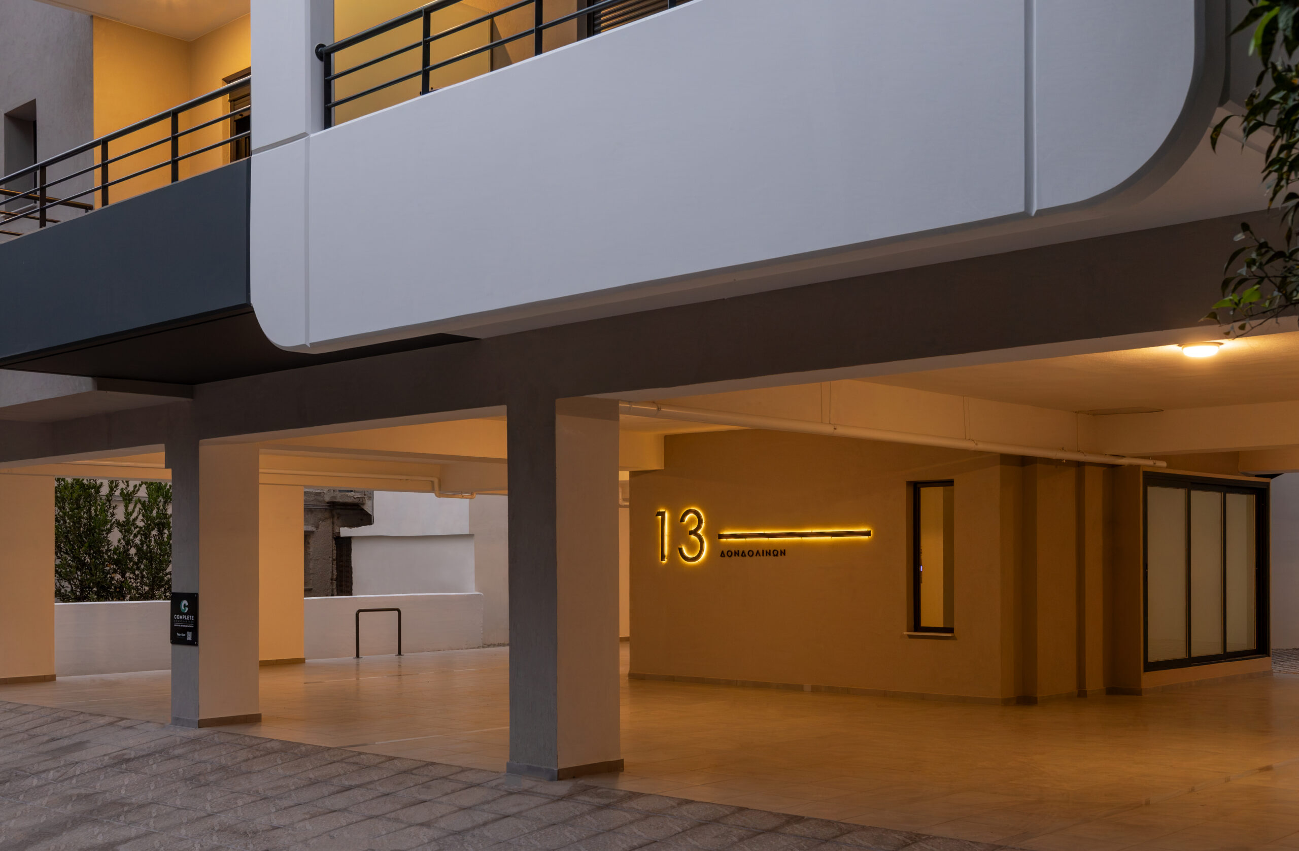Η αρχιτεκτονική σύνθεση βασίζεται στην πλαστικότητα των όγκων, που προσδίδουν ρυθμό και βάθος στην όψη. Οι λευκοί, καμπυλόμορφοι πρόβολοι μαλακώνουν την αυστηρότητα των γραμμών, ενώ οι ανθρακί επενδύσεις στα στηθαία και στις μεταλλικές λεπτομέρειες δημιουργούν διακριτικές αντιθέσεις και αναδεικνύουν τη γεωμετρία του κελύφους. Οι κατακόρυφες χαράξεις και οι στρογγυλεμένες ακμές συμβάλλουν σε ένα διαρκές παιχνίδι φωτός και σκιάς, που μεταβάλλεται καθ’ όλη τη διάρκεια της ημέρας. Η είσοδος του κτιρίου οργανώνεται με διακριτικό φωτισμό, ενώ ο αριθμός «13» λειτουργεί ως στοιχείο ταυτότητας και σχεδιαστικής υπογραφής. Στο εσωτερικό, η λιτότητα του εξωτερικού συνεχίζεται με ουδέτερες αποχρώσεις, γραμμικά φωτιστικά και μεταλλικά κιγκλιδώματα, συνθέτοντας έναν χώρο με μινιμαλιστικό αλλά ζεστό χαρακτήρα.