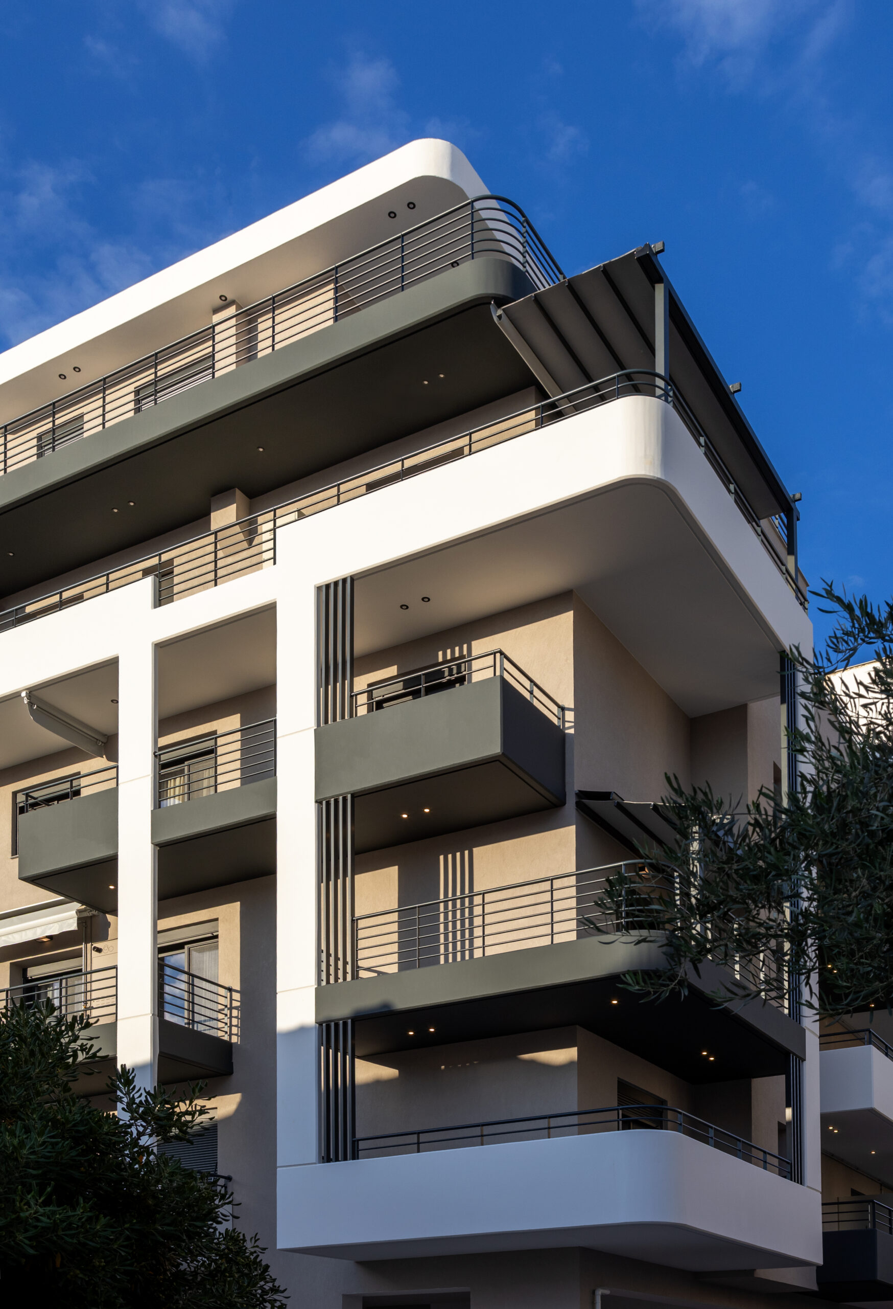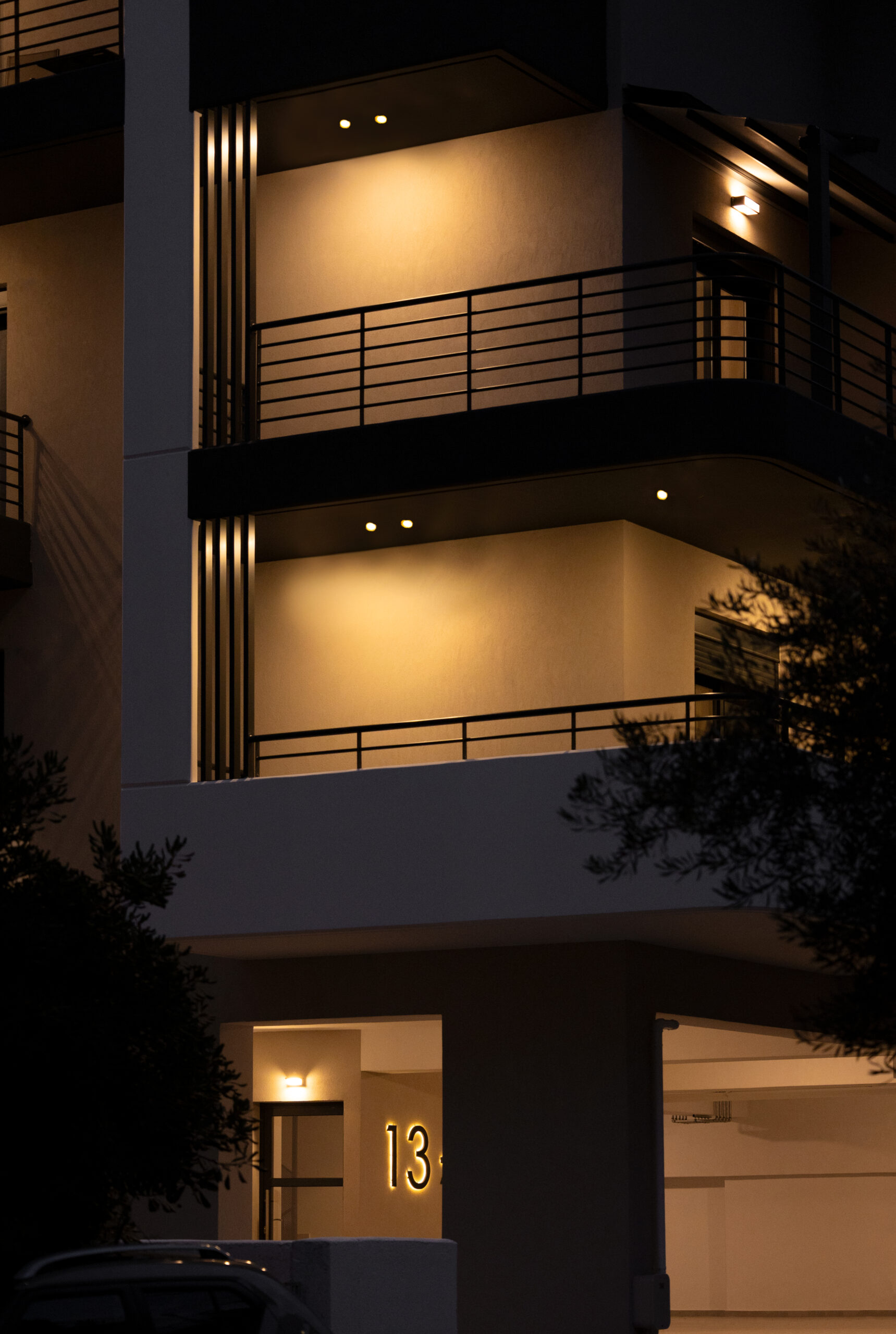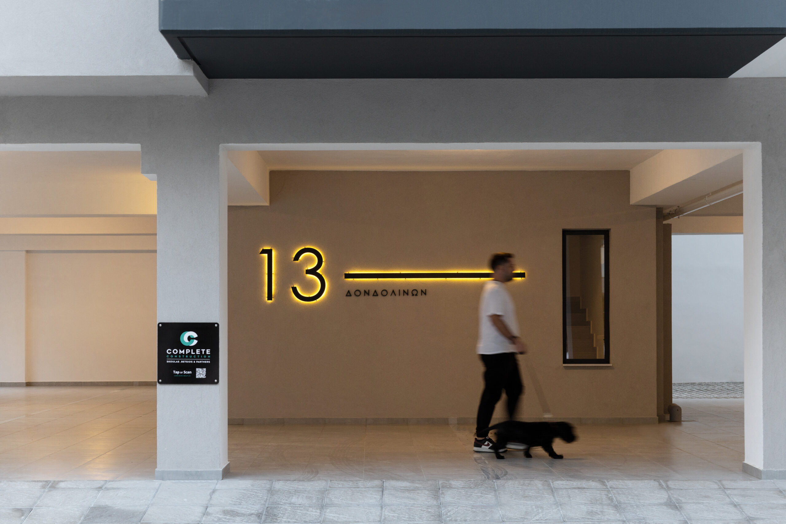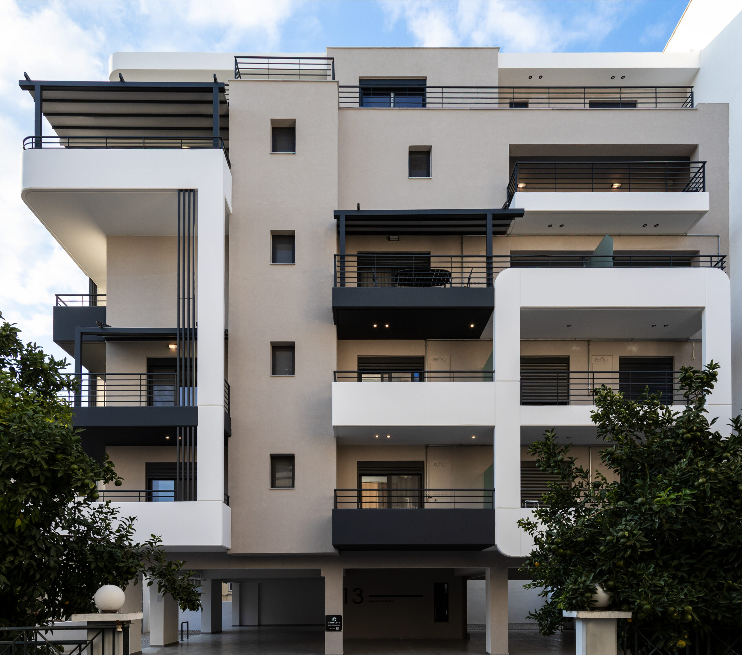 Η αρχιτεκτονική σύνθεση βασίζεται στην πλαστικότητα των όγκων, που προσδίδουν ρυθμό και βάθος στην όψη. Οι λευκοί, καμπυλόμορφοι πρόβολοι μαλακώνουν την αυστηρότητα των γραμμών, ενώ οι ανθρακί επενδύσεις στα στηθαία και στις μεταλλικές λεπτομέρειες δημιουργούν διακριτικές αντιθέσεις και αναδεικνύουν τη γεωμετρία του κελύφους. Οι κατακόρυφες χαράξεις και οι στρογγυλεμένες ακμές συμβάλλουν σε ένα διαρκές παιχνίδι φωτός και σκιάς, που μεταβάλλεται καθ’ όλη τη διάρκεια της ημέρας. Η είσοδος του κτιρίου οργανώνεται με διακριτικό φωτισμό, ενώ ο αριθμός «13» λειτουργεί ως στοιχείο ταυτότητας και σχεδιαστικής υπογραφής. Στο εσωτερικό, η λιτότητα του εξωτερικού συνεχίζεται με ουδέτερες αποχρώσεις, γραμμικά φωτιστικά και μεταλλικά κιγκλιδώματα, συνθέτοντας έναν χώρο με μινιμαλιστικό αλλά ζεστό χαρακτήρα.