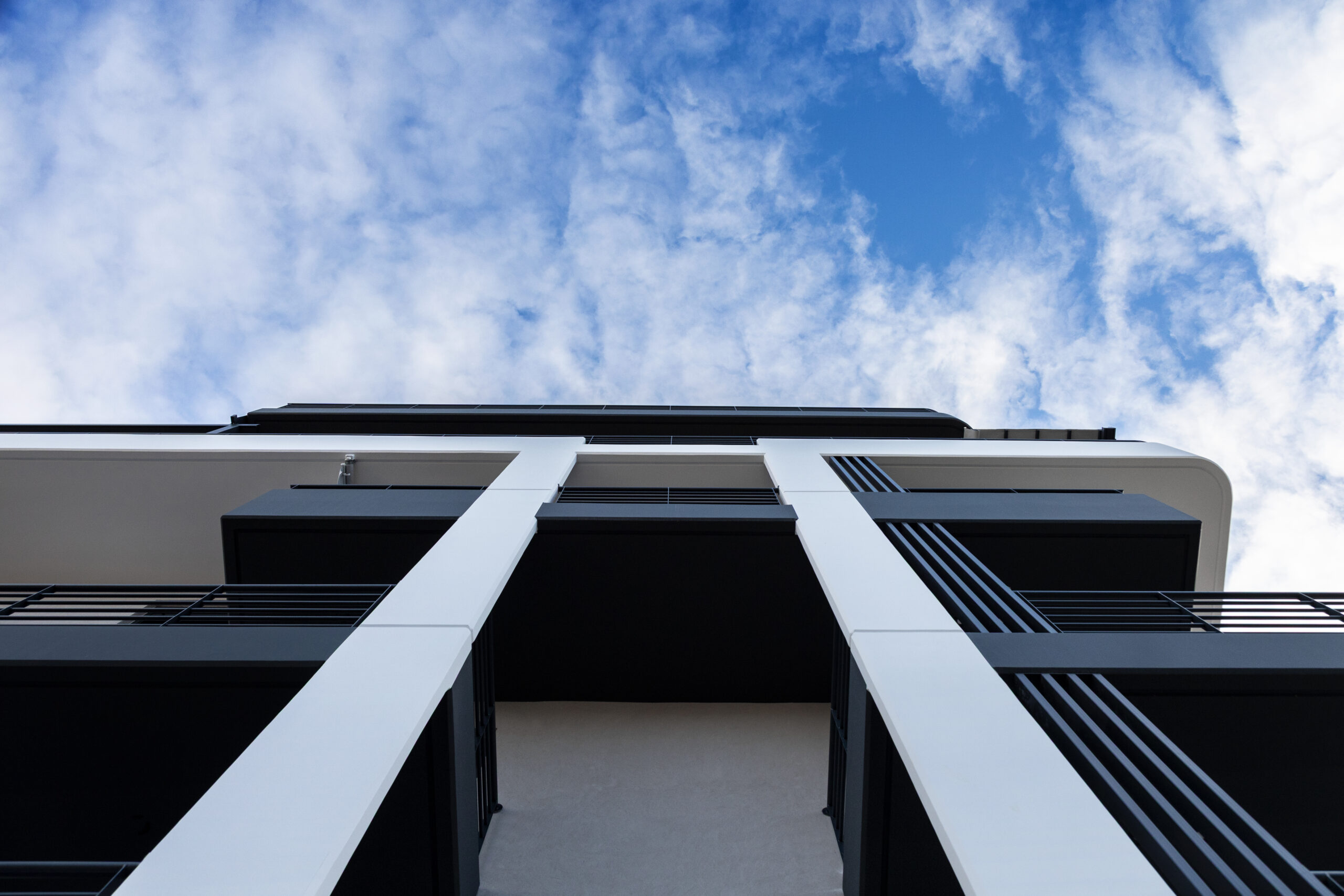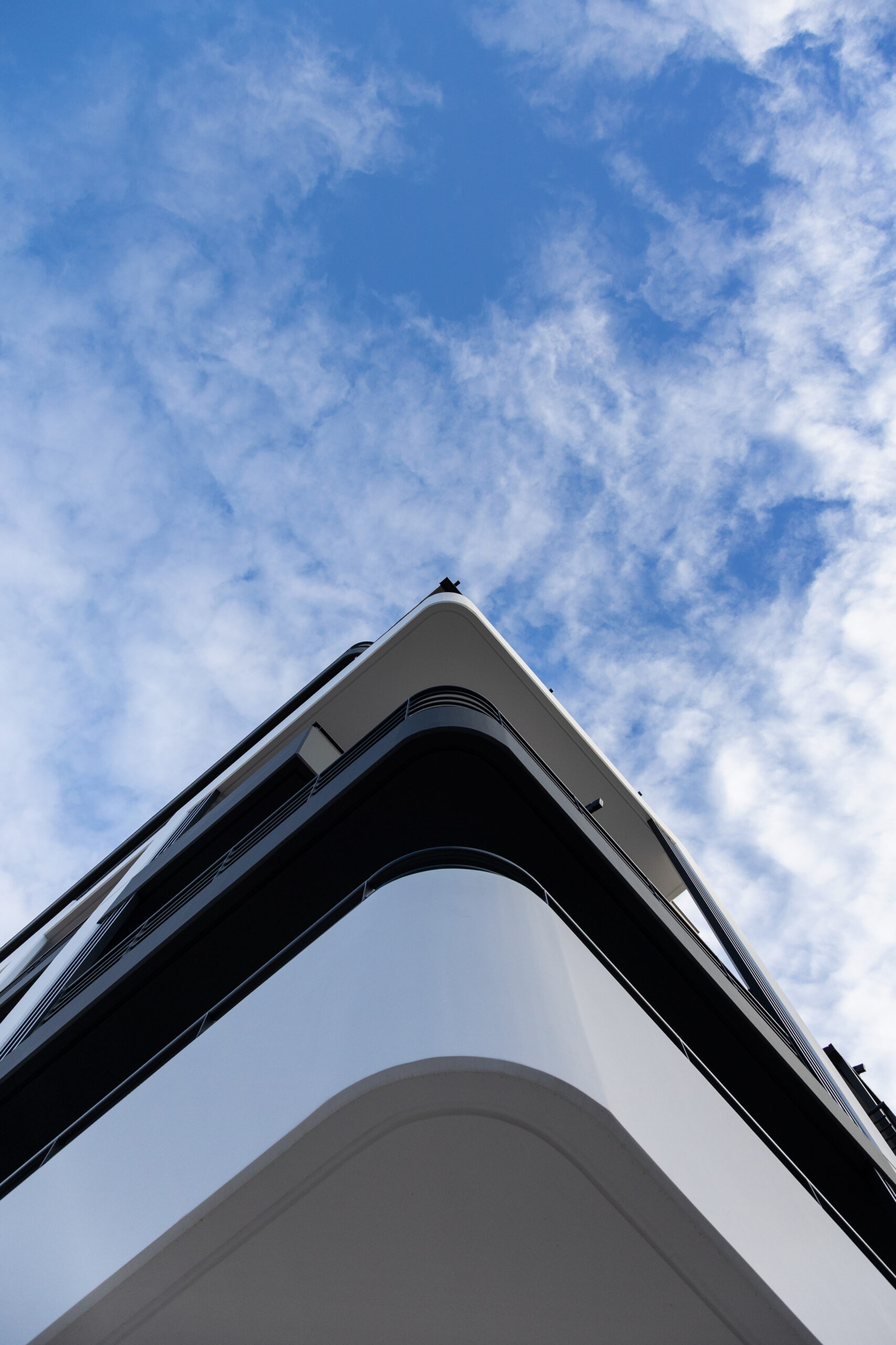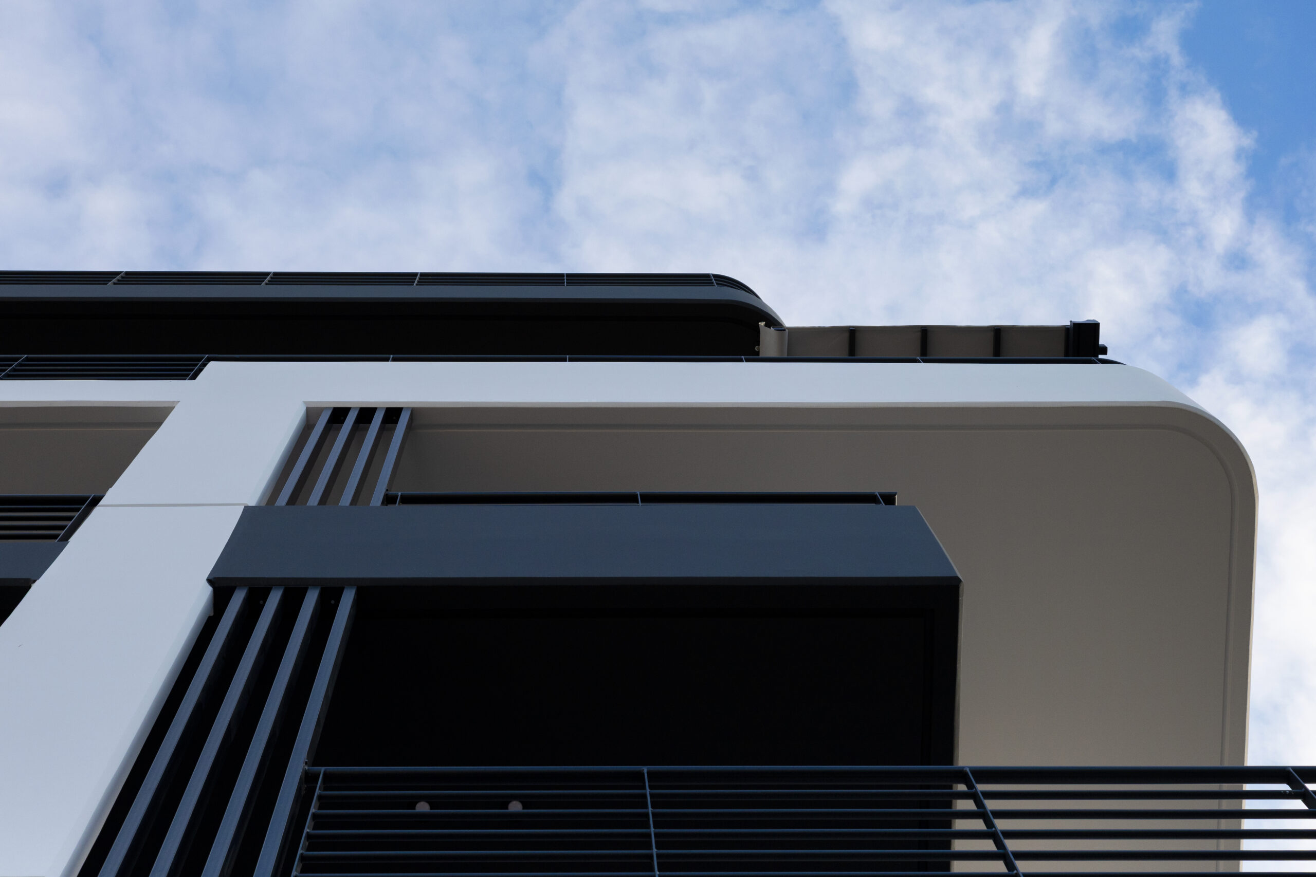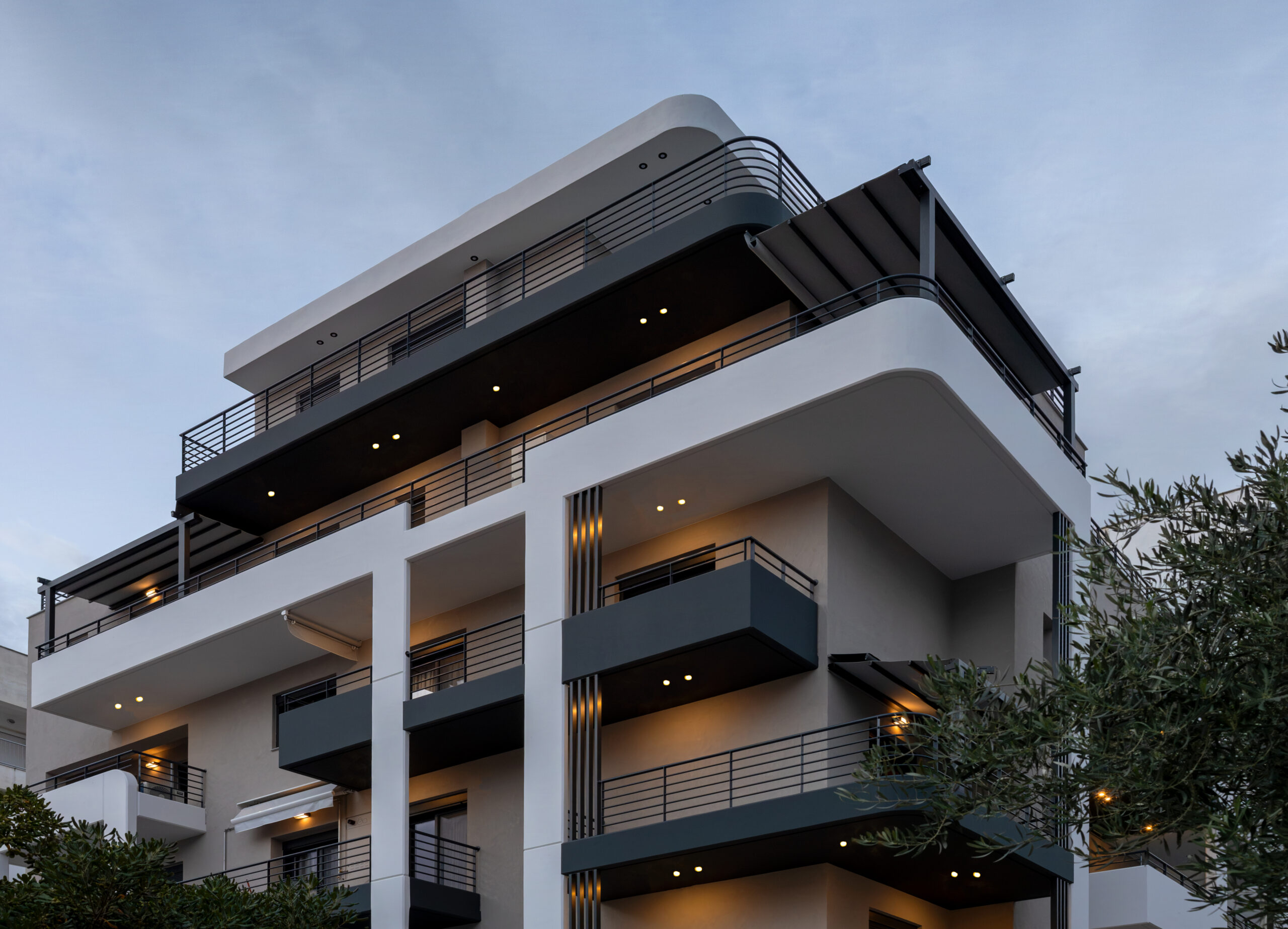 Η αρχιτεκτονική σύνθεση βασίζεται στην πλαστικότητα των όγκων, που προσδίδουν ρυθμό και βάθος στην όψη. Οι λευκοί, καμπυλόμορφοι πρόβολοι μαλακώνουν την αυστηρότητα των γραμμών, ενώ οι ανθρακί επενδύσεις στα στηθαία και στις μεταλλικές λεπτομέρειες δημιουργούν διακριτικές αντιθέσεις και αναδεικνύουν τη γεωμετρία του κελύφους. Οι κατακόρυφες χαράξεις και οι στρογγυλεμένες ακμές συμβάλλουν σε ένα διαρκές παιχνίδι φωτός και σκιάς, που μεταβάλλεται καθ’ όλη τη διάρκεια της ημέρας. Η είσοδος του κτιρίου οργανώνεται με διακριτικό φωτισμό, ενώ ο αριθμός «13» λειτουργεί ως στοιχείο ταυτότητας και σχεδιαστικής υπογραφής. Στο εσωτερικό, η λιτότητα του εξωτερικού συνεχίζεται με ουδέτερες αποχρώσεις, γραμμικά φωτιστικά και μεταλλικά κιγκλιδώματα, συνθέτοντας έναν χώρο με μινιμαλιστικό αλλά ζεστό χαρακτήρα.