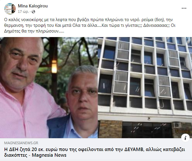 Αιχμές κατά του Δημάρχου Βόλου Αχιλλέα Μπέου, αφήνει με ανάρτησή της η πρ. Αντιδήμαρχος Στρατηγικού Σχεδιασμού, Διοίκησης και ΚΕΠ επί ημερών Μπέου, Μίνα Καλογήρου, με αφορμή την αποκάλυψη ότι η ΔΕΥΑΜΒ οφείλει 20 εκ. ευρώ στη ΔΕΗ από απλήρωτους λογαριασμούς ρεύματος. Όπως αναφέρει σε ανάρτησή της η κα Καλογήρου κοινοποιώντας την δημοσίευση του Magnesianews: