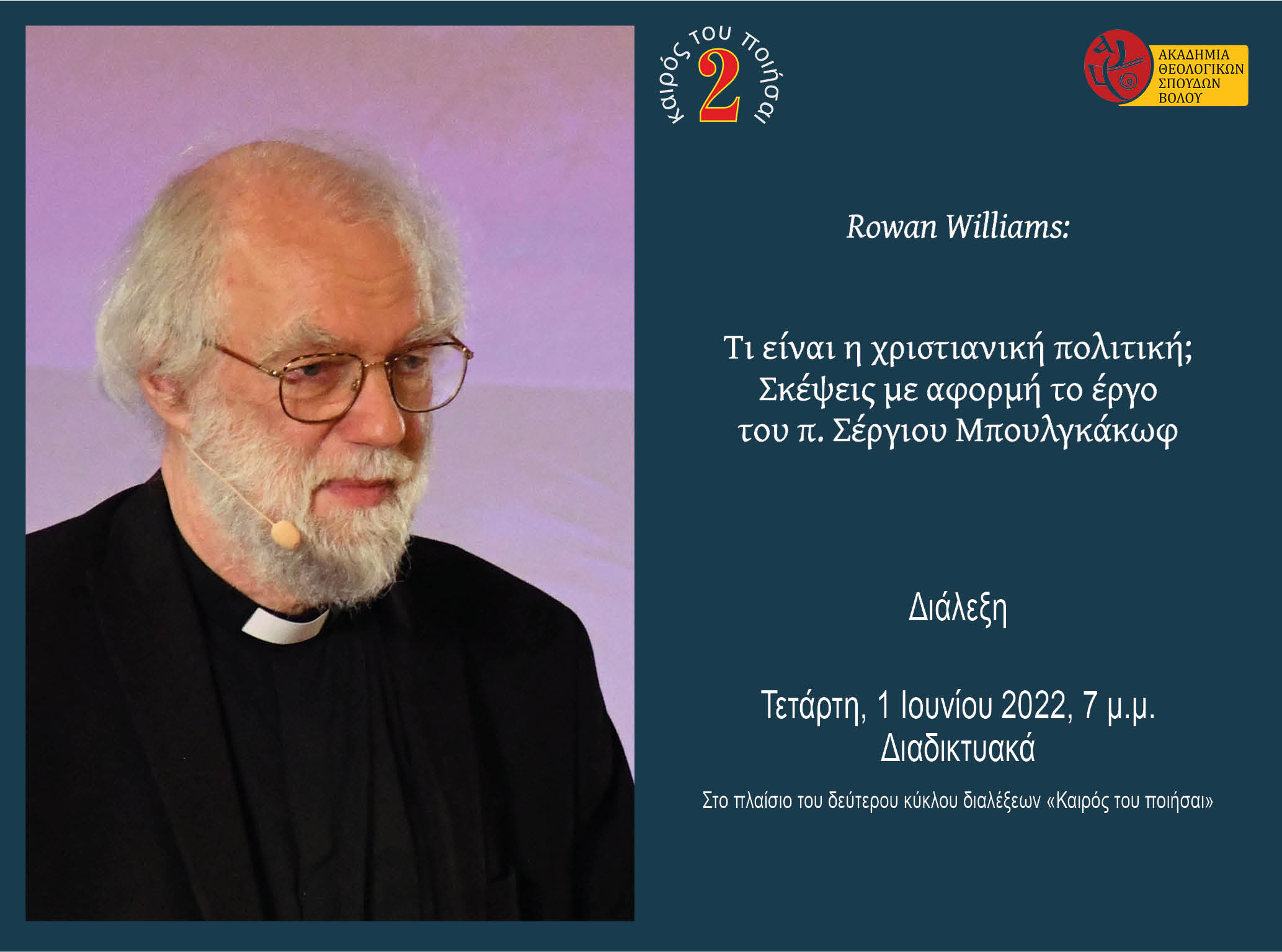 Η ένατη, προτελευταία διάλεξη του φετινού κύκλου «Καιρός του ποιήσαι» της Ακαδημίας Θεολογικών Σπουδών Βόλου θα πραγματοποιηθεί αύριο, Τετάρτη 1 Ιουνίου στις 7:00 μ.μ. με ομιλητή τον Σεβασμιώτατο Ρόουαν Ουίλλιαμς, ομότιμο πανεπιστημιακό καθηγητή (Magdalene College, Κέιμπριτζ) και αρχιεπίσκοπο πρώην Κανταουρίας, και με θέμα «Τι είναι η χριστιανική πολιτική; Σκέψεις με αφορμή το έργο του π. Σέργιου Μπουλγκάκωφ». Η διάλεξη θα είναι διαδικτυακή, προσβάσιμη μέσω της πλατφόρμας Zoom στη διεύθυνση https://us06web.zoom.us/j/88466878903 και θα δοθεί στα αγγλικά με ταυτόχρονη μετάφραση στα ελληνικά.