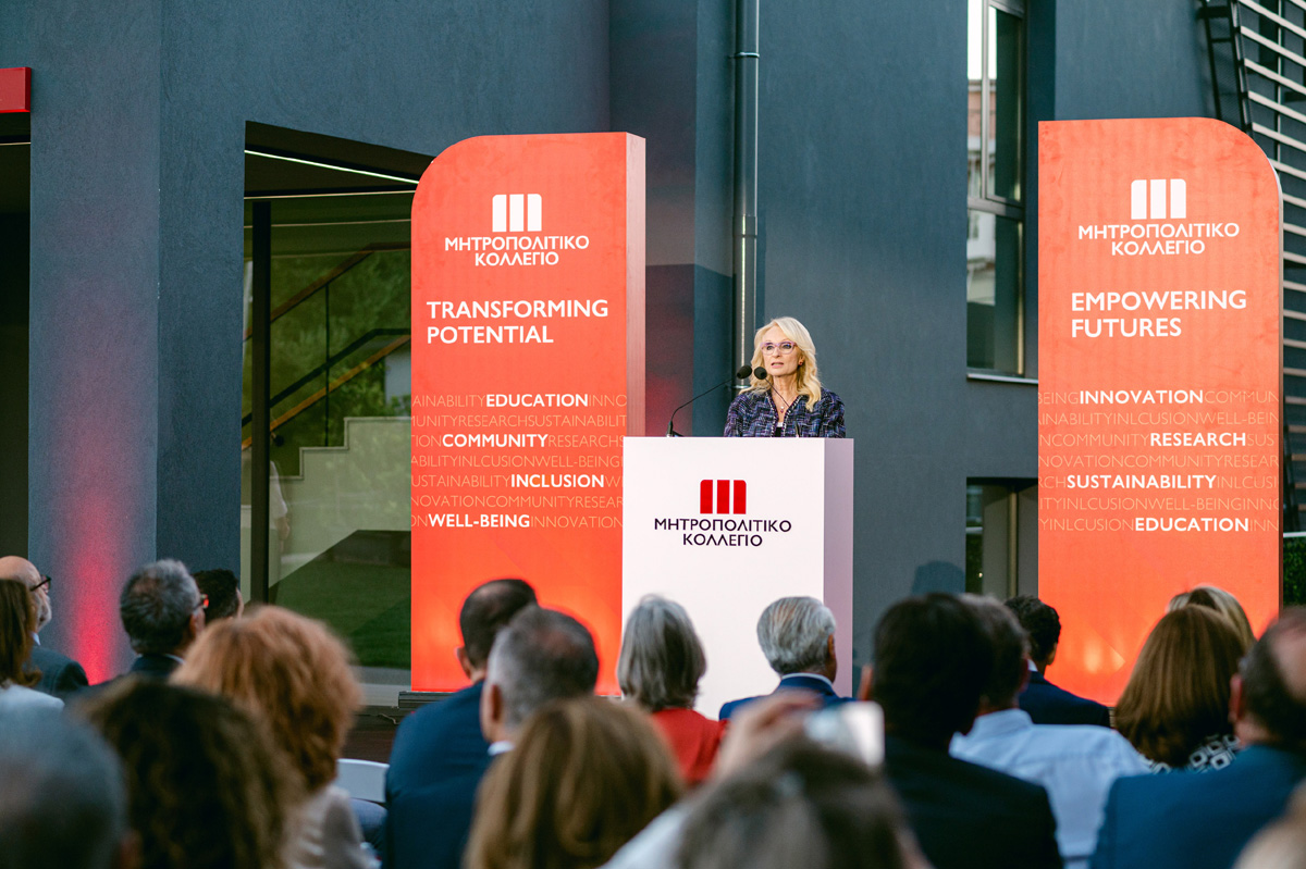 H Διευθύνουσα Σύμβουλος του Εκπαιδευτικού Ομίλου Μητροπολιτικό-ΑΚΜΗ, Καλλιόπη Ροδοπούλου, έδωσε το στίγμα του νέου πρωτοποριακού εγχειρήματος: «Η πρώτη ιδιωτική Πανεπιστημιακή Κλινική στην Αποκατάσταση, αποτελεί έργο που όμοιό του αυτή τη στιγμή δεν υπάρχει σε εκπαιδευτικό ίδρυμα στην Ελλάδα. Παραδίδουμε στους φοιτητές μας, στο επιστημονικό μας προσωπικό αλλά και στην ευρύτερη κοινότητα ένα υπερσύγχρονο κτίριο σχεδιασμένο ειδικά όχι απλά για να εξυπηρετήσει τις αυξημένες ανάγκες μας που προέρχονται από την ανάπτυξη του Μητροπολιτικού Κολλεγίου, αλλά να προσφέρει την πιο πλούσια εμπειρία στους φοιτητές μας με την αξιοποίηση καινοτόμων εκπαιδευτικών μεθόδων, να εμπνεύσει όλους τους διδάσκοντες, να εξασφαλίσει εργασιακές συνθήκες υψηλής ποιότητας στα στελέχη μας». Αναφερόμενη στη δυναμική πορεία του Ομίλου και του Μητροπολιτικού Κολλεγίου δήλωσε: «Από την αρχή της πορείας μας, είμαστε στο πλευρό κάθε φοιτητή, προσφέροντας σύγχρονα πανεπιστημιακά προγράμματα, έχοντας συνεισφέρει κομβικά στην ιδιωτική Τριτοβάθμια Εκπαίδευση της χώρας. Δημιουργήσαμε ένα εκπαιδευτικό μοντέλο που «δοκιμάζεται» με επιτυχία στην αγορά πέντε δεκαετίες με την επιτυχημένη δράση των χιλιάδων αποφοίτων του». Η Διευθύνουσα Σύμβουλος του Ομίλου ολοκλήρωσε την ομιλία της με μία είδηση για τα εκπαιδευτικά τεκταινόμενα και το Μητροπολιτικό Κολλέγιο: «Σήμερα θέλω να μοιραστώ μαζί σας μία δέσμευση. Το Μητροπολιτικό Κολλέγιο θα είναι το πρώτο Κολλέγιο που θα λάβει άδεια Ιδιωτικού Πανεπιστημίου στην Ελλάδα».