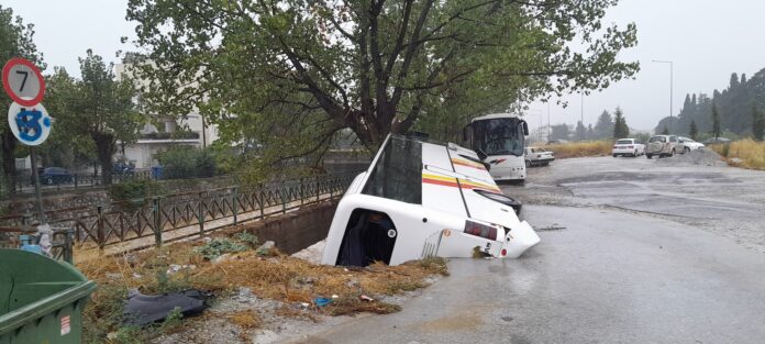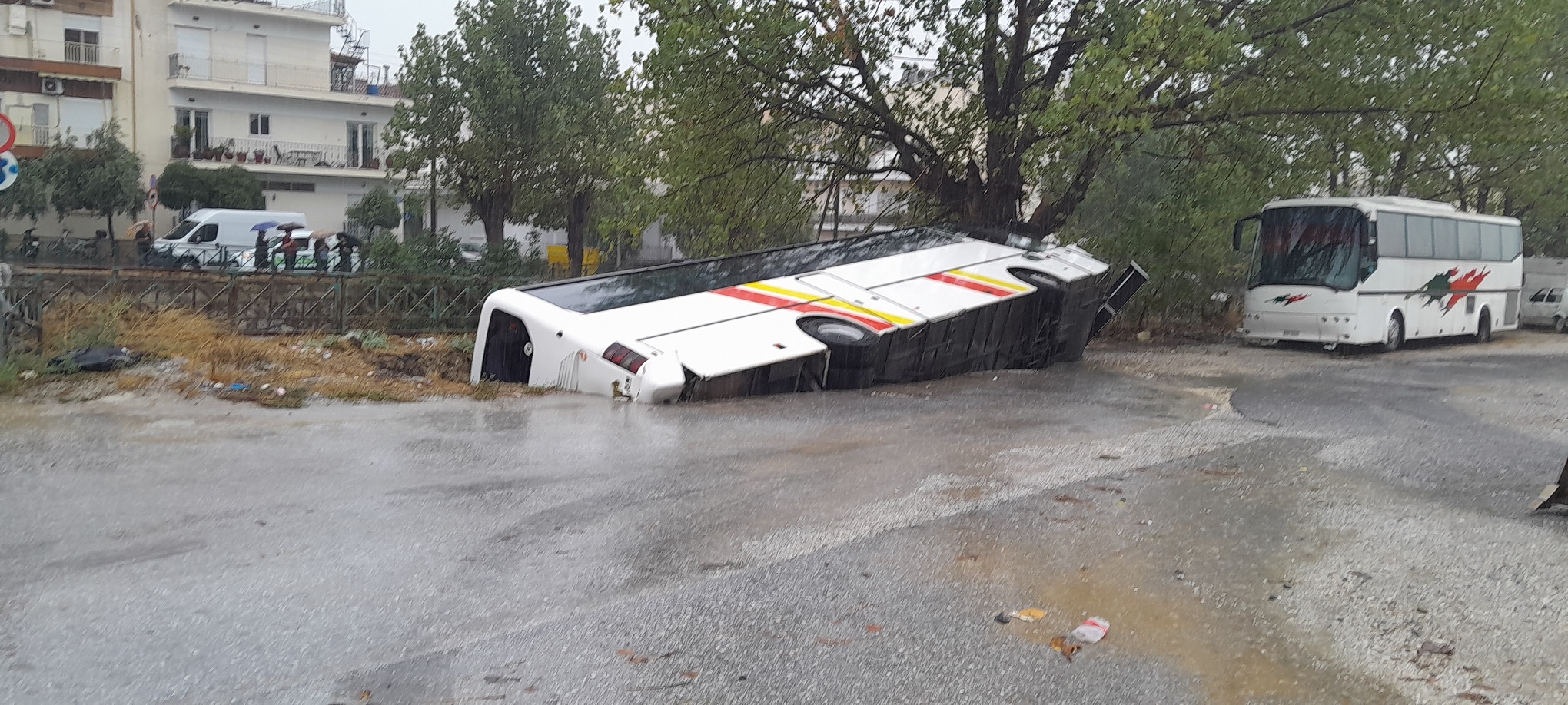 Τα ορμητικά νερά στους παρόχθιους του Κραυσίδωνα είχαν σαν αποτέλεσμα να υποχωρήσει το έδαφος και η γη να «καταπιεί» ολόκληρο λεωφορείο το οποίο ήταν σταθμευμένο δίπλα στο πεζοδρόμιο.