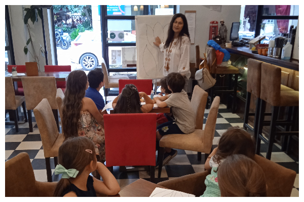 Πραγματοποιήθηκε ξενάγηση των επισκεπτών από την υπεύθυνη των εργαστηρίων στην έκθεση, ενώ ακολούθησε ανοιχτό εργαστήρι Βυζαντινής Ζωγραφικής για τα παιδιά εντός του χώρου, που φιλοξένησε την έκθεση και συγκεκριμένα στο χώρο εστίασης «4 Εποχές», Τ. Οικονομάκη & Σπυρίδη στο Βόλο, δημιουργώντας έναν ρόδακα με τις τεχνικές, που εφαρμόζονται στα εισαγωγικά μαθήματα της Βυζαντινής ζωγραφικής.