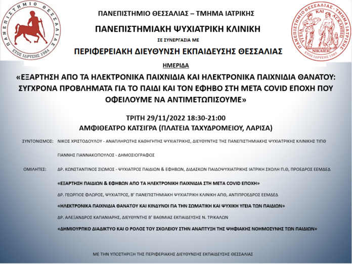 Η Ψυχιατρική Κλινική του Πανεπιστημίου Θεσσαλίας σε συνεργασία με την Περιφερειακή Δ/νση Εκπαίδευσης Θεσσαλίας, διοργανώνει Ημερίδα για την Εξάρτηση των παιδιών στο διαδίκτυο με τίτλο «Εξάρτηση από τα ηλεκτρονικά παιχνίδια και ηλεκτρονικά παιχνίδια θανάτου: Σύγχρονα προβλήματα για το παιδί και τον έφηβο στη μετά COVID εποχή που οφείλουμε να αντιμετωπίσουμε».