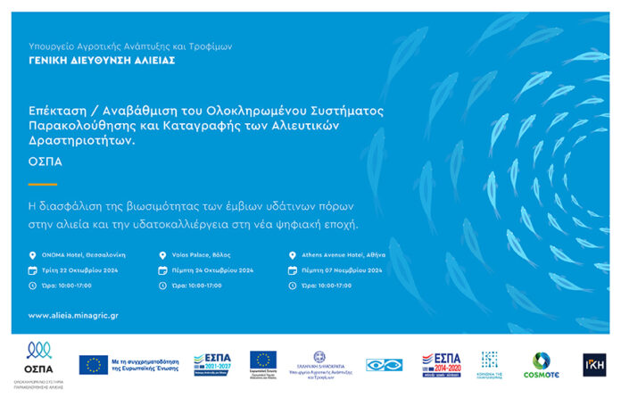 Θα διεξαχθεί την Πέμπτη 24 Οκτωβρίου στο ξενοδοχείο Volos Palace στον Βόλο στις 10 το πρωί. Το ΟΣΠΑ αποτελεί το κύριο ψηφιακό εργαλείο διαχείρισης και παρακολούθησης των αλιευτικών δραστηριοτήτων και η επέκταση/αναβάθμισή του περιλαμβάνεται τόσο στη Βίβλο του Ψηφιακού Μετασχηματισμού 2020-2025, όσο και στην Ψηφιακή Στρατηγική του υπουργείου Αγροτικής Ανάπτυξης και Τροφίμων 2021-2025.