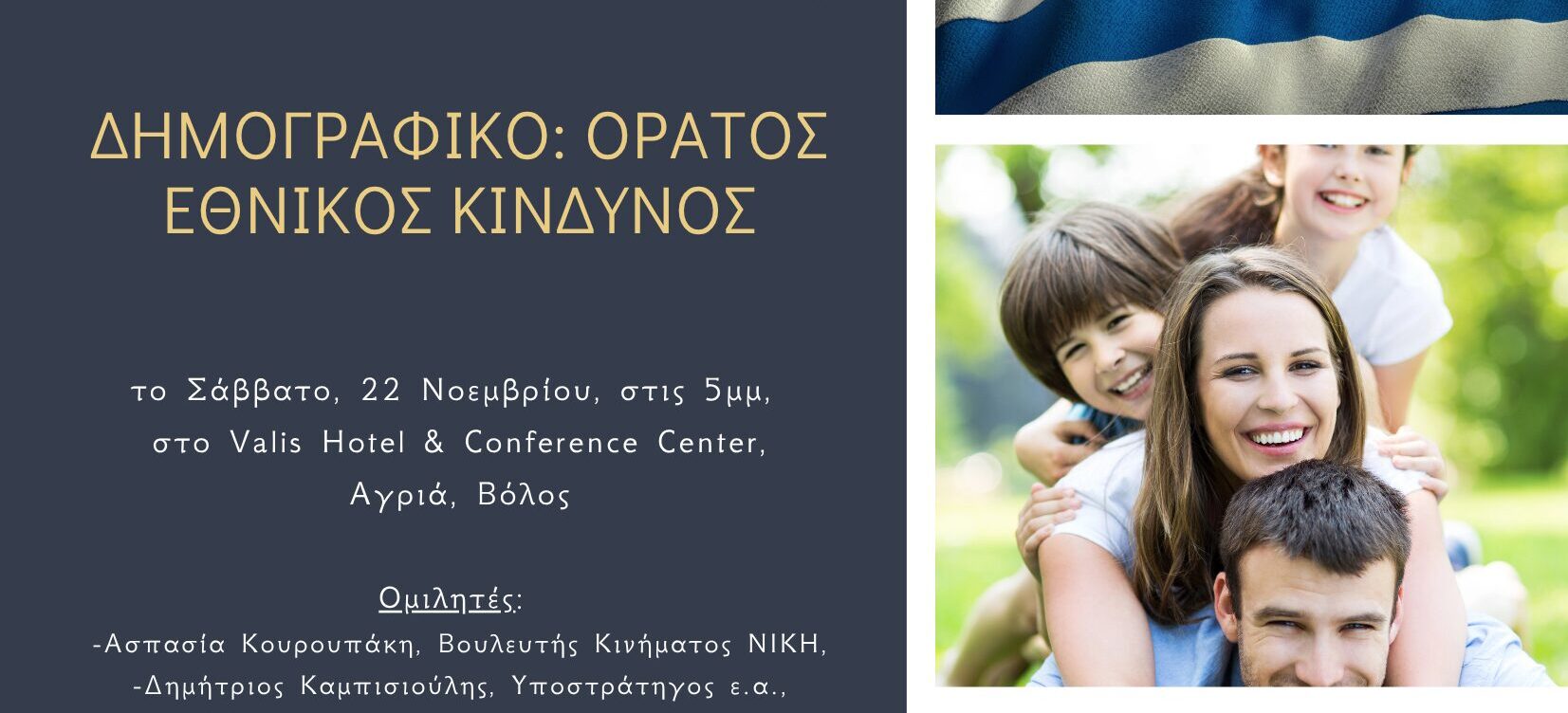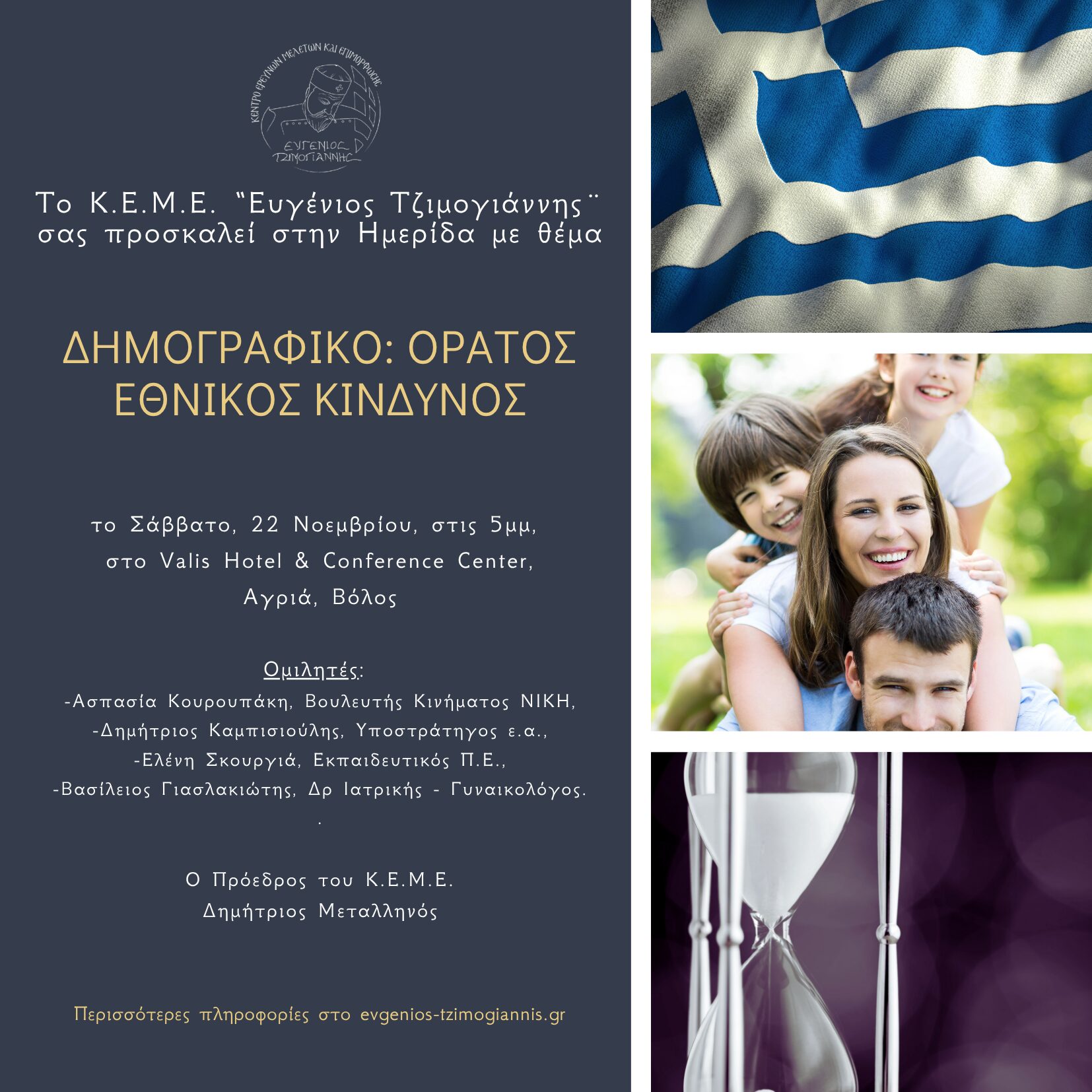 Το Κ.Ε.Μ.Ε. «Ευγένιος Τζιμογιάννης» πραγματοποιεί ημερίδα με θέμα «Δημογραφικό: Ορατός Εθνικός Κίνδυνος» το Σάββατο 22 Νοεμβρίου στις 5 μ.μ. στο Valis Hotel στην Αγριά.