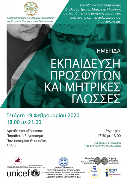 Στο πλαίσιο εορτασμού της Διεθνούς Ημέρας Μητρικής Γλώσσας, που καθιερώθηκε από την UNESCO το 1999, με σκοπό την ενίσχυση της γλωσσικής επίγνωσης και της πολυγλωσσίας, διοργανώνεται ημερίδα με θέμα «Εκπαίδευση προσφύγων και μητρικές γλώσσες» στον Βόλο, την Τετάρτη 19 Φεβρουαρίου 2020, ώρες 17.30 με 21.00, στο αμφιθέατρο “Σαράτση” του Παραλιακού Συγκροτήματος του Πανεπιστημίου Θεσσαλίας στον Βόλο.