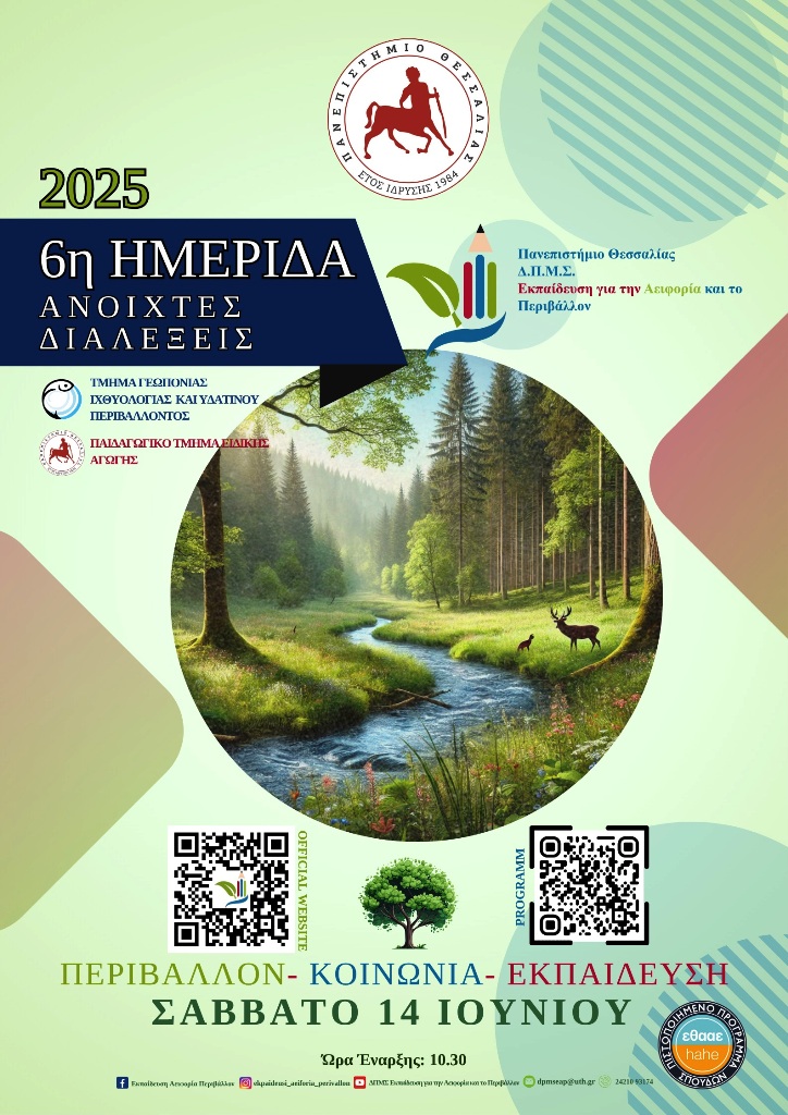 Το Δ.Π.Μ.Σ. «Εκπαίδευση για την Αειφορία και το Περιβάλλον» διοργανώνει αύριο Σάββατο 14 Ιουνίου 2025 την 6η Ημερίδα – Ανοιχτές Διαλέξεις με τίτλο «Περιβάλλον, Κοινωνία & Εκπαίδευση».