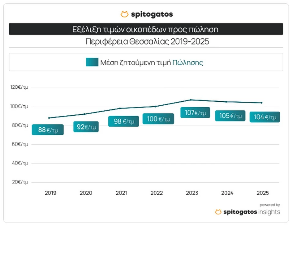 Στην αγορά γης, η μέση ζητούμενη τιμή πώλησης οικοπέδων έχει αυξηθεί κατά 17,8% από το 2019. Ωστόσο, την περίοδο 2023-2024 σημειώθηκε μικρή διόρθωση της τάξης του 1,8%, πιθανότατα ως απόρροια των εκτεταμένων ζημιών από την κακοκαιρία «Ντάνιελ». Η σταθεροποίηση συνεχίστηκε και το 2024-2025, με οριακή υποχώρηση 1,3%.
