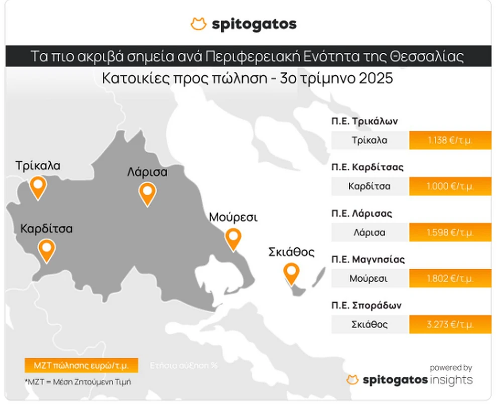 Η μεγαλύτερη ετήσια αύξηση στις ζητούμενες τιμές κατοικιών καταγράφηκε στην ΠΕ Καρδίτσας (+19,2%), ενώ άνοδο άνω του 10% παρουσίασε και η ΠΕ Μαγνησίας. Οι χαμηλότερες τιμές εξακολουθούν να παρατηρούνται σε Καρδίτσα και Τρίκαλα, ενώ οι υψηλότερες εντοπίζονται στις Σποράδες, όπου η μέση ζητούμενη τιμή φθάνει τα 2.632 ευρώ/τ.μ.