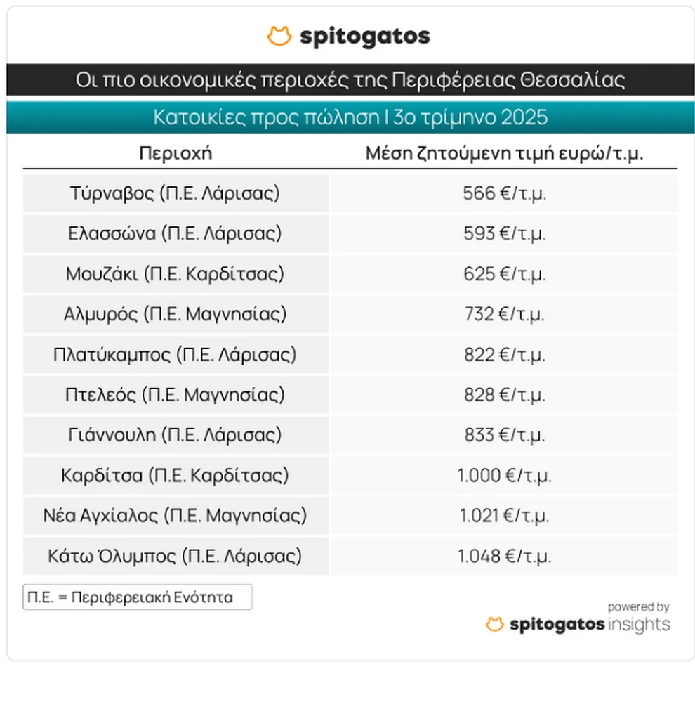 Στον αντίποδα, μεταξύ των πιο οικονομικών περιοχών συγκαταλέγονται ο Τύρναβος, η Ελασσόνα, το Μουζάκι, ο Αλμυρός και ο Πλατύκαμπος.