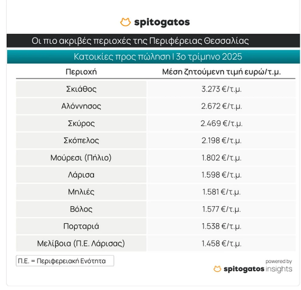 Τα νησιά των Σποράδων κυριαρχούν στο top 10 των πιο ακριβών περιοχών της Θεσσαλίας. Η Σκιάθος παραμένει η ακριβότερη, με μέση ζητούμενη τιμή 3.273 ευρώ/τ.μ., ενώ ακολουθούν Αλόννησος, Σκύρος, Σκόπελος και η περιοχή Μούρεσι στο Πήλιο (1.802 ευρώ/τ.μ.).