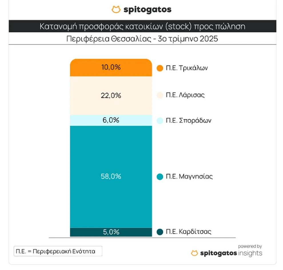 Περισσότερο από το 50% της διαθέσιμης προσφοράς κατοικιών προς πώληση εντοπίζεται στη Μαγνησία, με τη Λάρισα να ακολουθεί (22%) και τα Τρίκαλα να καλύπτουν το 10% του συνολικού stock. Μικρότερα ποσοστά καταγράφονται σε Καρδίτσα και Σποράδες.