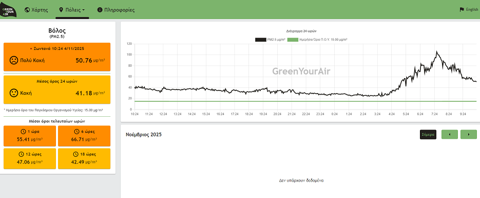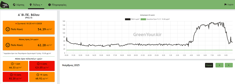 Κακή, χαρακτηρίζει η ιστοσελίδα «GreenYourAir» του Τμήματος Μηχανολόγων Μηχανικών του Πανεπιστημίου Θεσσαλίας την ατμόσφαιρα σήμερα το πρωί στον Βόλο, με τα μικροσωματίδια ΡΜ 2,5 να είναι στα 49,7 μικρογραμμάρια ανά κυβικό μέτρο αέρα, όταν το όριο που έχει θεσπίσει ο Παγκόσμιος Οργανισμός Υγείας είναι μόλις 15μg/m3.