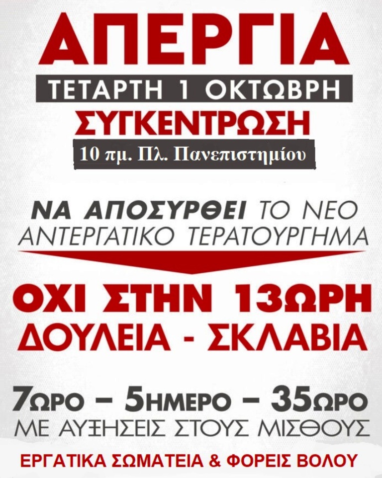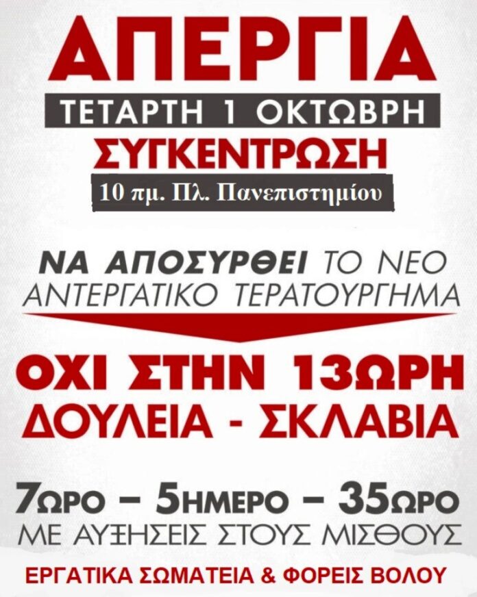 Κάλεσμα για συμμετοχή των εργαζομένων στην Πανελλαδική απεργία στη 1 Οκτωβρίου και στην απεργιακή συγκέντρωση που θα γίνει στις 10 το πρωί στην Πλατεία Πανεπιστημίου, απευθύνουν τα εργατικά σωματεία και φορείς του Βόλου, ενάντια σε ακόμη ένα αντεργατικό νομοσχέδιο.