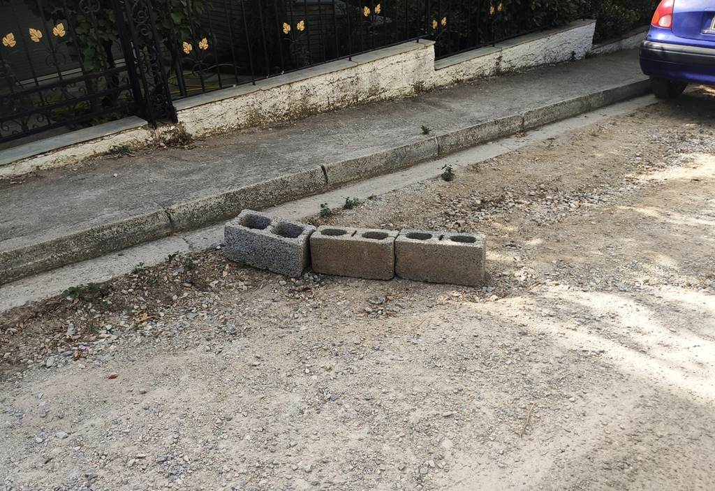 Ο ιδιοκτήτης έχει έτοιμα τσιμεντόλιθα, στην περίπτωση που βρέξει έντονα, να τα τοποθετήσει στο δρόμο, για να αλλάξει η ροή του νερού, προκειμένου να μην πλημμυρίσει τον σπίτι του ξανά.