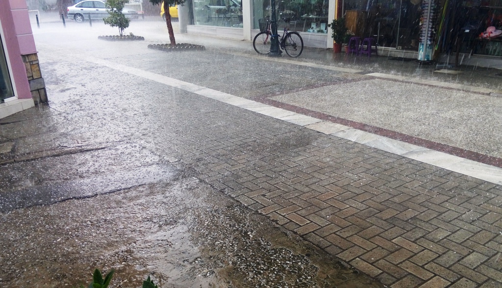 Λίγο πριν τις 6 το απόγευμα, μετά από δυνατούς κεραυνούς που έπεσαν, στις 18.10 ξεκίνησε πολύ δυνατή σε ένταση βροχόπτωση για περίπου 10 λεπτά, ενώ κάποια στιγμή έπεσε και χαλάζι, για περίπου μισό λεπτά της ώρας.