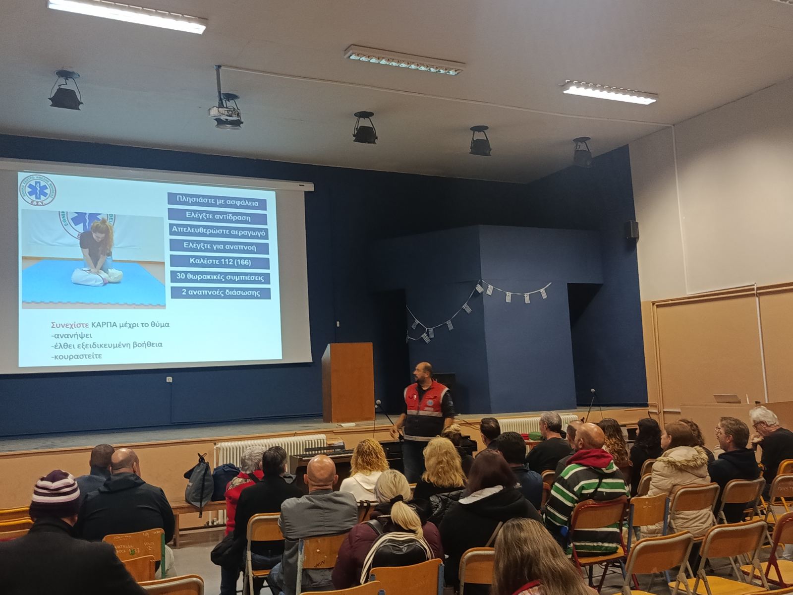 Η εκπαίδευση περιλάμβανε δύο ενότητες. Στην πρώτη, παρουσιάστηκαν οι βασικές αρχές παροχής πρώτων βοηθειών και τα κρίσιμα βήματα της Καρδιοπνευμονικής Αναζωογόνησης, μέσα από ουσιαστικό διάλογο και ανταλλαγή εμπειριών.