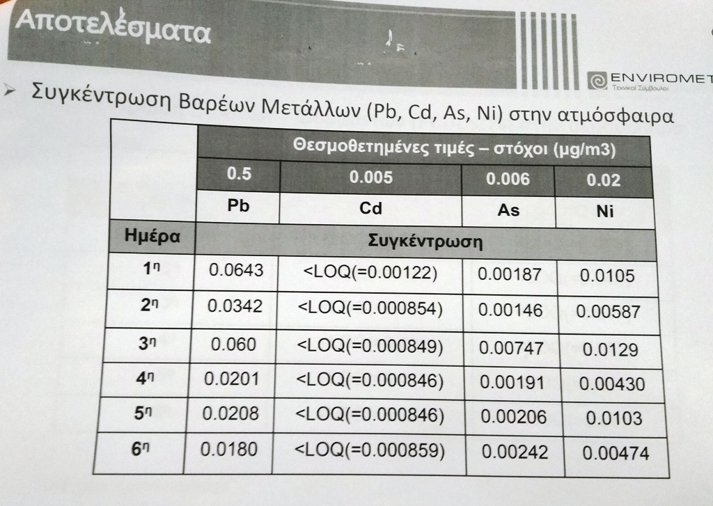 Ο κ. Σίσκος ανέφερε ότι όπως προκύπτει από τα αποτελέσματα των μετρήσεων σε όλα τα στοιχεία οι τιμές είναι μικρότερες από τα όρια, εκτός από μια στιγμιαία υπέρβαση στο Αρσενικό, που όπως μπορεί να εξομαλυνθεί όλο το χρόνο. Για τις διοξίνες και τα φουράνια ανέφερε δεν υπάρχει όριο στη συγκέντρωση και στις μετρήσεις ελήφθη υπόψη η τιμή – στόχος που ισχύει στη Γερμανία.