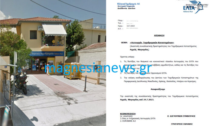 Σήμερα στον εξωτερικό χώρο του ΕΛΤΑ στην Αγριά υπάρχει και η σχετική ανακοίνωση για την αναστολή λειτουργίας του υποκαταστήματος.