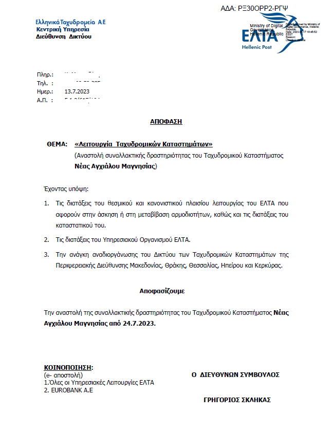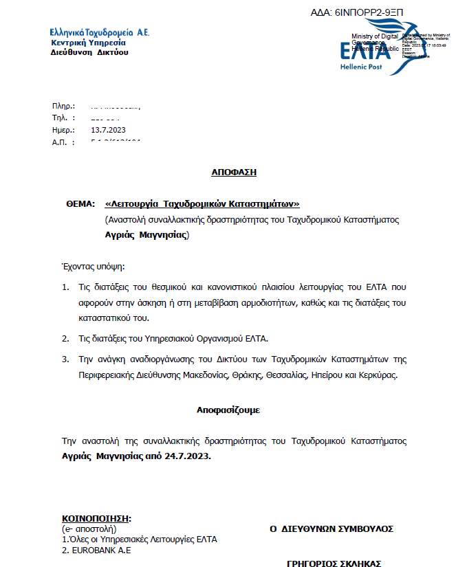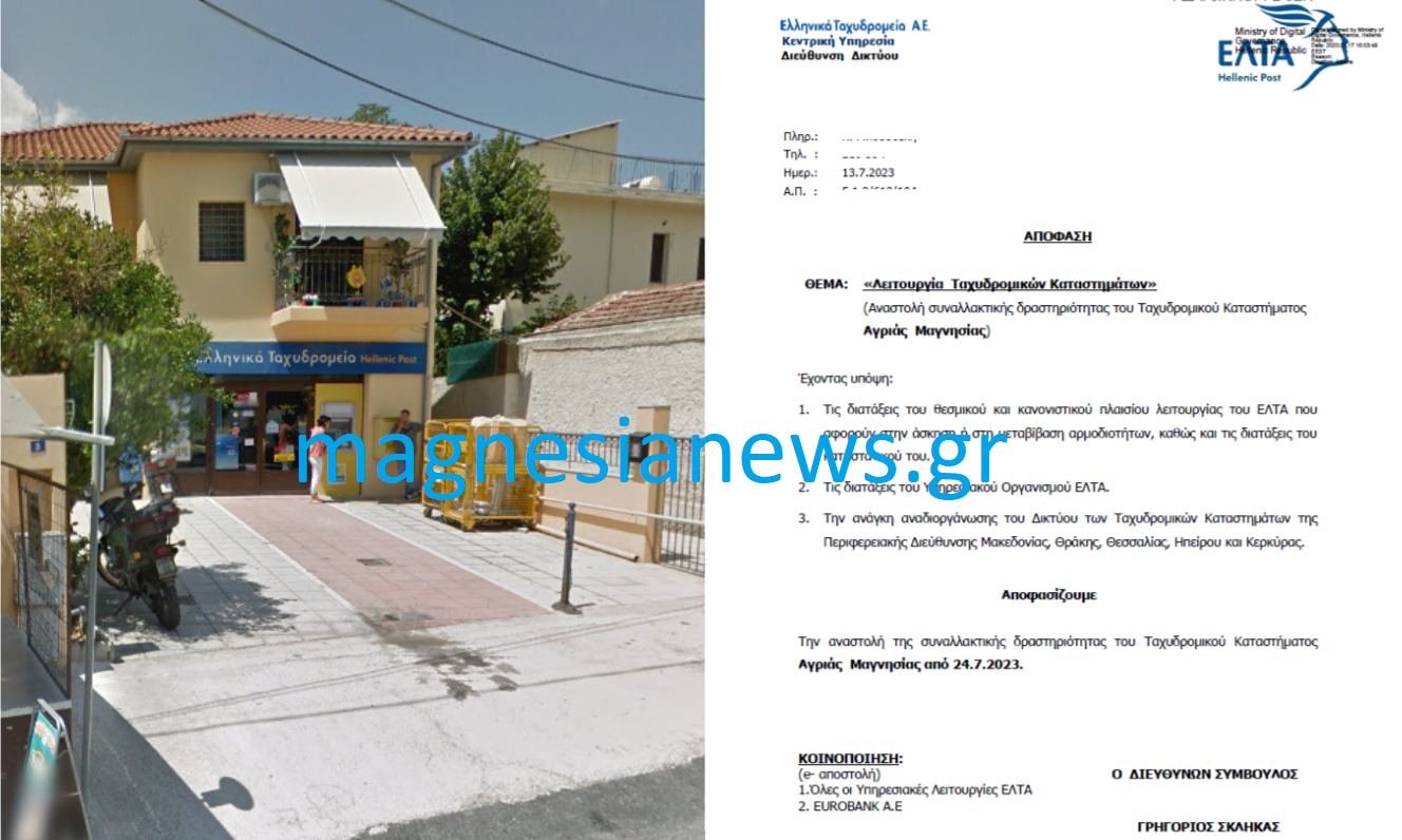 Οι αποφάσεις για την αναστολή της λειτουργίας των υποκαταστημάτων των ΕΛΤΑ σε Αγριά και Νέα Αγχίαλο έχουν αναρτηθεί στη ΔΙΑΥΓΕΙΑ.