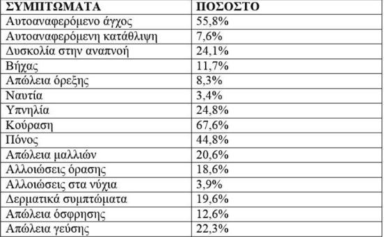 Κόπωση και πόνος εξακολουθούν να ταλαιπωρούν μεγάλο μέρος των ασθενών που νοσηλεύτηκαν με COVID-19 κατά την πρώτη τους επίσκεψη στο ιατρείο παρακολούθησης, ένα με δύο μήνες μετά το εξιτήριο. Ένας στους τέσσερις δηλώνει επίσης πως εξακολουθεί να έχει δύσπνοια ή υπνηλία, ένας στους πέντε δερματικά συμπτώματα, απώλεια μαλλιών, απώλεια γεύσης ή αλλοιώσεις στην όραση, ενώ χαμηλότερα ποσοστά αναφέρουν άλλα επιμένοντα συμπτώματα. Μικρότερο ποσοστό ασθενών αναφέρει ψυχική συμπτωματολογία, η οποία έχει άμεση σύνδεση με σωματικά συμπτώματα, αλλά και με δημογραφικά χαρακτηριστικά, ενώ η συνολική αξιολόγηση της ποιότητας ζωής είναι ικανοποιητική.