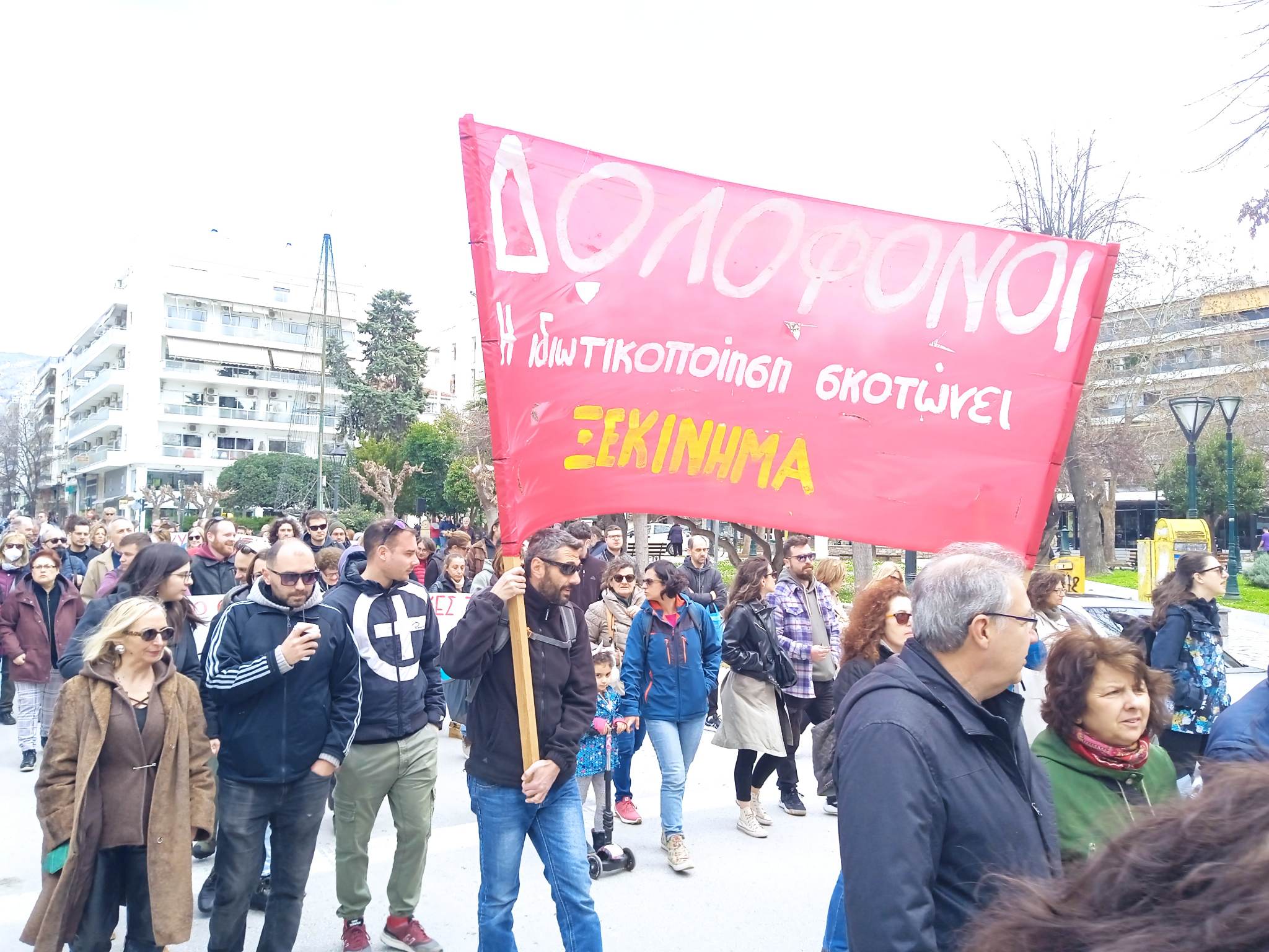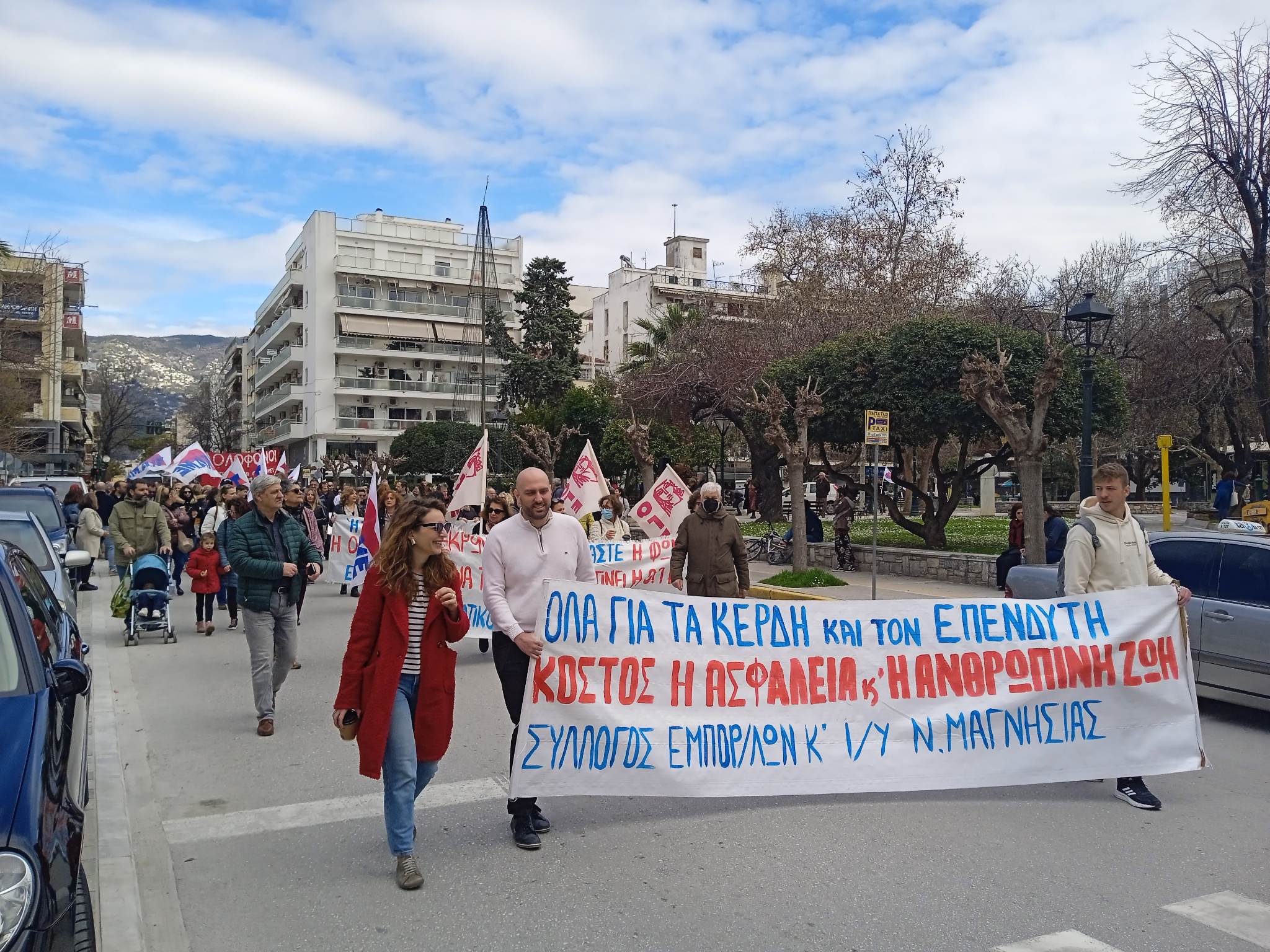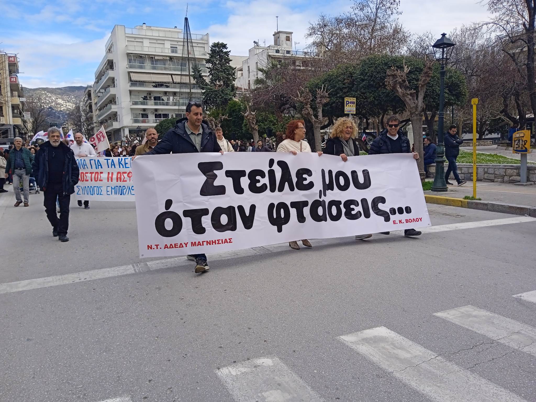 Συνεχίζουμε αταλάντευτα στο δρόμο του αγώνα. Κλείνουμε τ’ αυτιά μας στις σειρήνες της «σωφροσύνης» και της «μετριοπάθειας». Δεν δίνουμε συγχωροχάρτια σε κανέναν. Την ερχόμενη Πέμπτη 16 του Μάρτη, μέρα γενικής πανελλαδικής απεργίας, οι δρόμοι του Βόλου πρέπει να πλημμυρίσουν για μια ακόμα φορά. Καλούμε όλα τα σωματεία να πάρουν άμεσα αποφάσεις συμμετοχής στην απεργία, να οργανώσουν τη μαζική συμμετοχή των μελών τους στην απεργία.