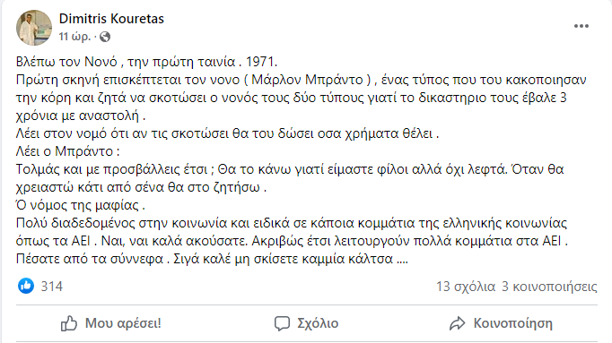Σε μια ανάρτηση «βόμβα» προχώρησε στα μέσα κοινωνικής δικτύωσης ο γνωστός Καθηγητής του Τμήματος Βιοχημείας του Πανεπιστημίου Θεσσαλίας κ. Δημήτρης Κουρέτας κάνοντας λόγο για τον νόμο της μαφίας και πόση σχέση έχει με τα ελληνικά Πανεπιστήμια.