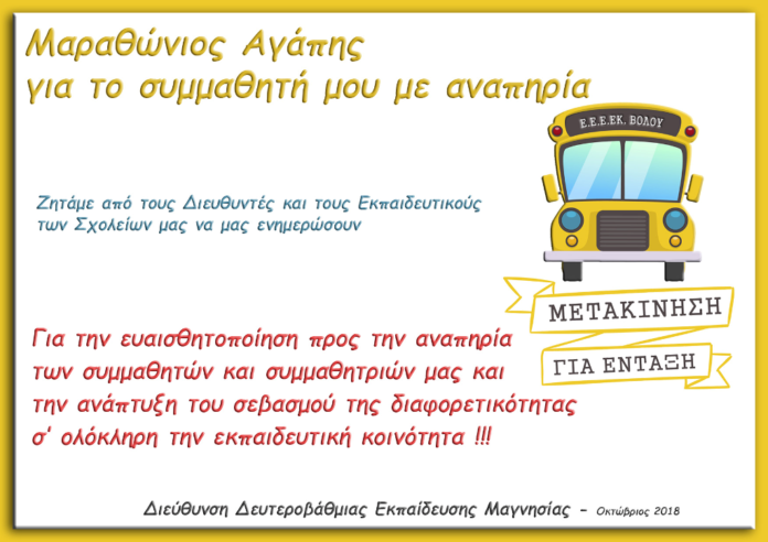 Ξεκίνησε και συνεχίζεται η προσπάθεια για την αγορά λεωφορείου στο ΕΕΕΕΚ Βόλου, με τον τίτλο, «Μαραθώνιος Αγάπης για το Συμμαθητή μου με Αναπηρία».