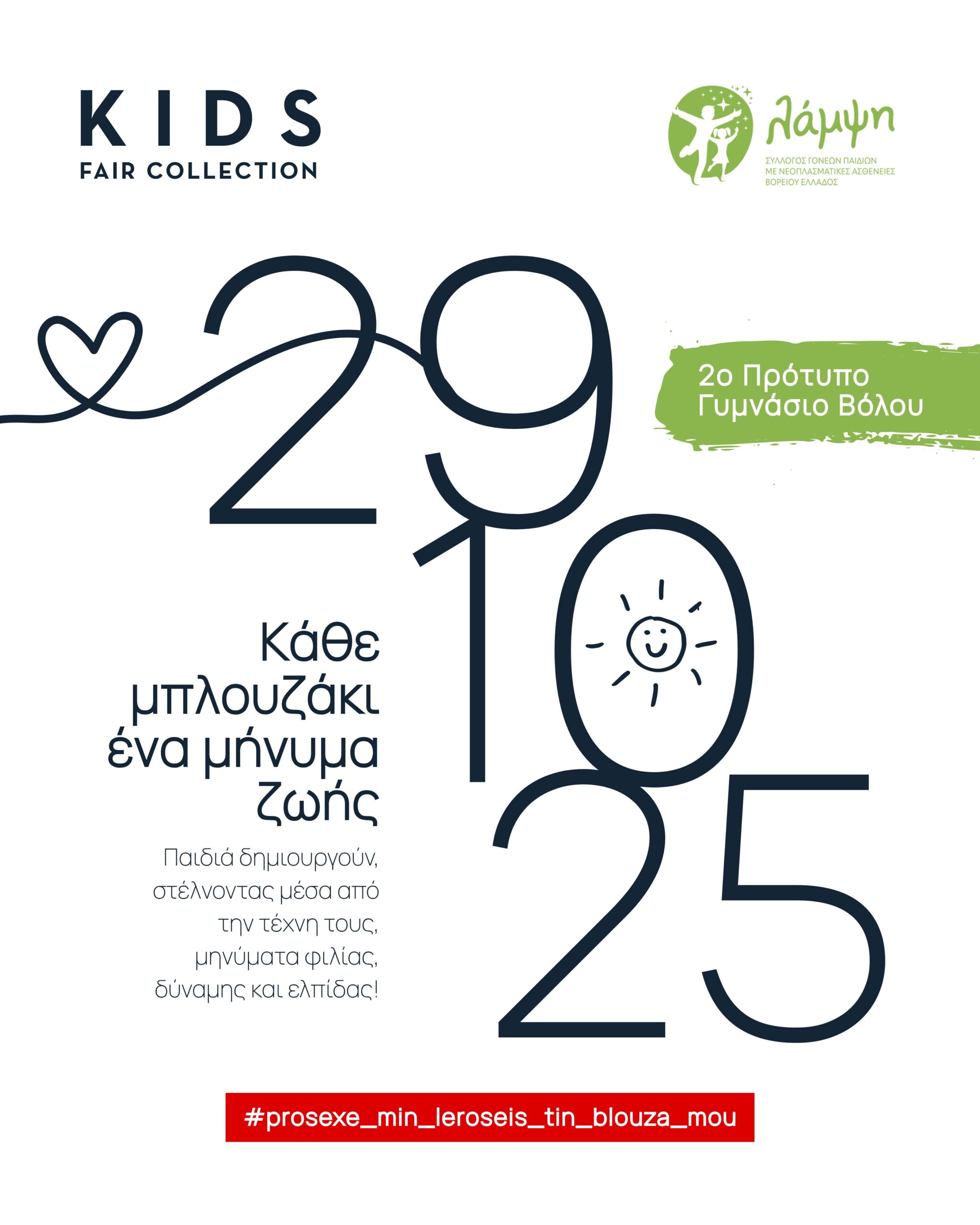 Η ΜΚΟ Kids Fair Collection υλοποιεί τη νέα της πρωτοβουλία με τίτλο #prosexe_min_leroseis_tin_blouza_mou, αφιερωμένη στα 60 παιδιά του Συλλόγου «Λάμψη» στη Θεσσαλονίκη — από βρέφη λίγων μηνών έως και 18 ετών — που αντιμετωπίζουν νεοπλασματικές παθήσεις.