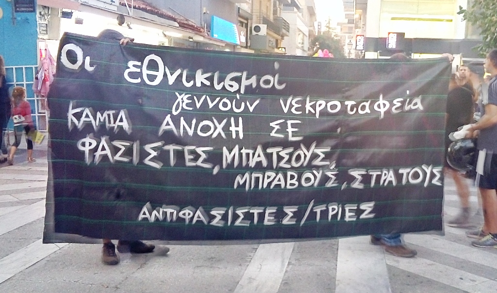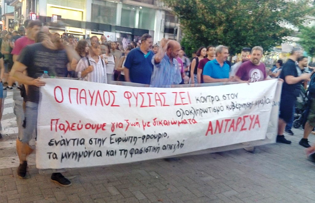 Μαζική είναι η πορεία έγινε το απόγευμα σε κεντρικούς δρόμους του Βόλου με αφορμή τα πέντε χρόνια από τη δολοφονία του Παύλου Φύσσα, ενώ αντιεξουσιαστές έγραψαν συνθήματα.