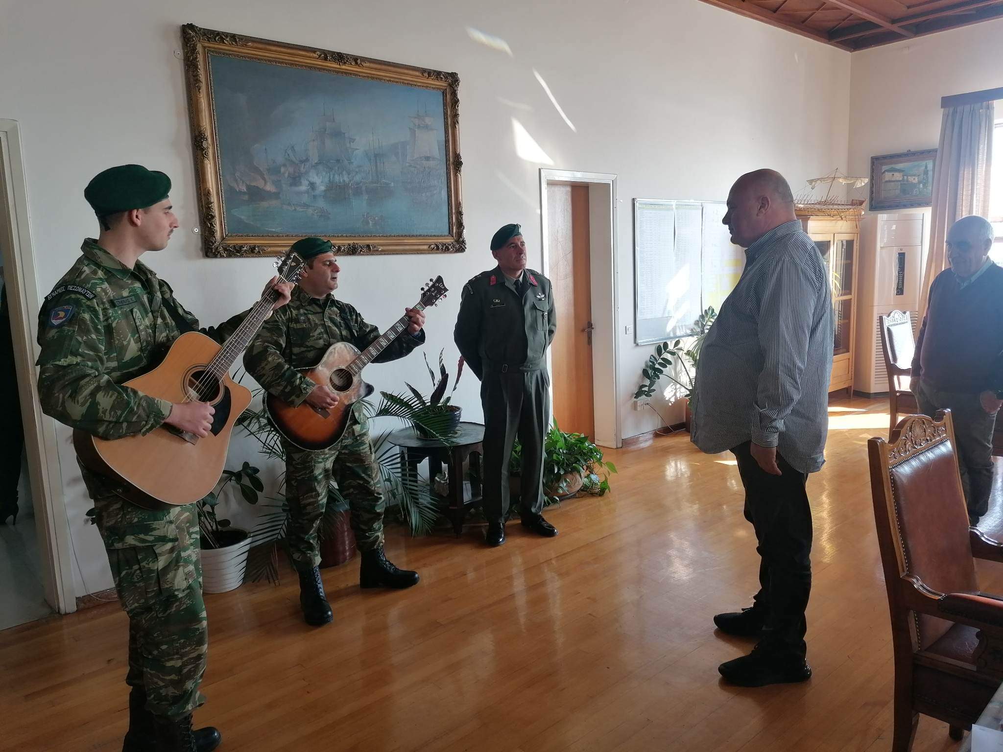 Με Σάκη Ρουβά και το ερωτικό τραγούδι “Χρόνια πολλά”, που είναι ένα από τα αγαπημένα του Αχιλλέα Μπέου, ευχήθηκαν φέτος οι πεζοναύτες της 32ης Ταξιαρχίας Πεζοναυτών στον Δήμαρχο Βόλου.Οι Πεζοναύτες με επικεφαλής τον Ταγματάρχη Δημήτριο Σάννα, τραγούδησαν παραδοσιακά κάλαντα και Χριστουγεννιάτικες μελωδίες στο Γραφείο του Δημάρχου Βόλου και στις υπηρεσίες που στεγάζονται στο κεντρικό Δημαρχείο.