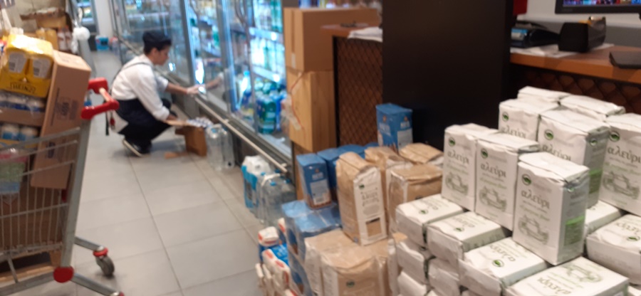 Από νωρίς, οι εργαζόμενοι δέχτηκαν τις προμήθειες και προσπαθούν να τις ταξινομήσουν στα ράφια, με την επάρκεια των προϊόντων να είναι οφθαλμοφανής. Δεν υπάρχει έλλειψη σε τρόφιμα, λαχανικά και είδη προσωπικής υγιεινής και συστήνουν στους πολίτες να μην πανικοβάλλονται.
