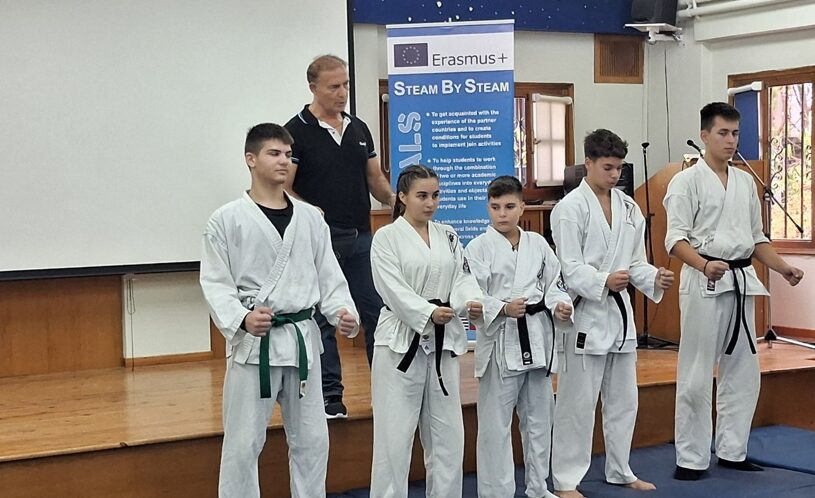 Τη σκυτάλη των παρουσιάσεων διαδέχτηκε ο κ. Ιωάννης Στεφάνου, δάσκαλος Καράτε, όπου μέσα σε απόλυτη προσήλωση, απευθυνόμενος στους μαθητές μίλησε για αξίες και ιδανικά που αποκτώνται με τη βοήθεια του αθλητισμού και των σωστών προτύπων. Μαζί του υπήρχε ομάδα μαθητών που πλαισίωναν την παρουσίαση κι όλο αυτό σε μεγάλο ενθουσιασμό από τους μαθητές.