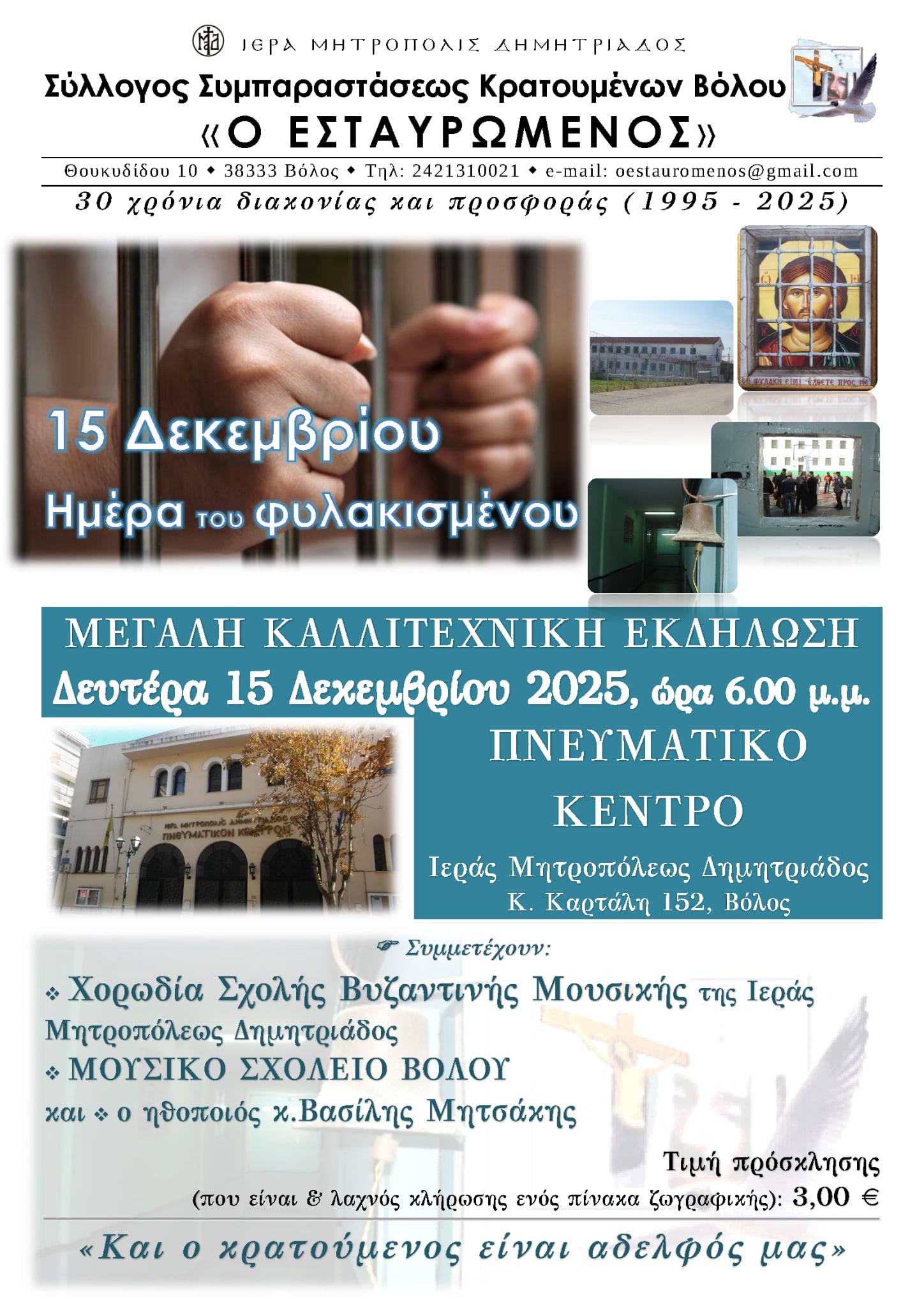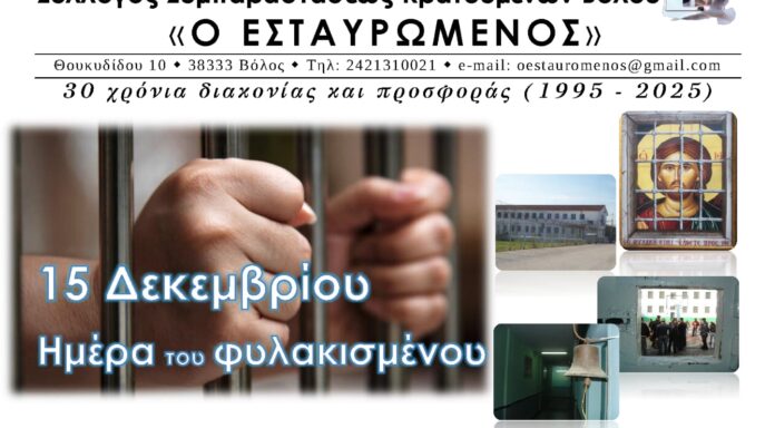 Στις 15 Δεκεμβρίου εορτάζεται η Ημέρα του φυλακισμένου και ο «Εσταυρωμένος» προετοιμάζει εκείνη την ημέρα στις 6 το απόγευμα στο Πνευματικό Κέντρο της Μητρόπολης Δημητριάδος (Κ. Καρτάλη 152) μία μεγάλη καλλιτεχνική εκδήλωση.