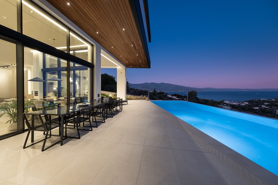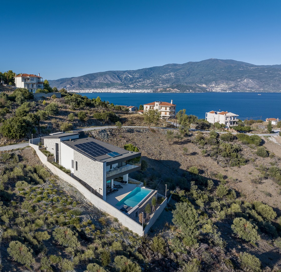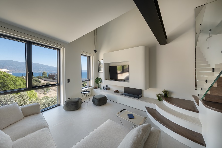 Οι χώροι του καθιστικού και της τραπεζαρίας με τα μεγάλα υαλοπετάσματα λειτουργούν σαν παρατηρητήριο προς τον Παγασητικό, το Πήλιο με τα Νότια χωριά του και τα διάσπαρτα σπίτια του οικισμού σε πρώτο πλάνο.