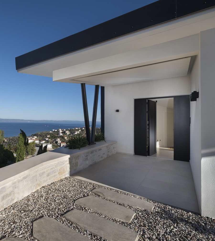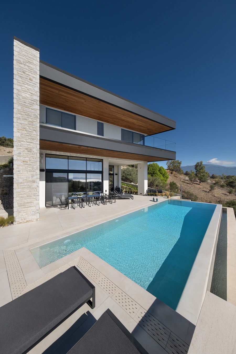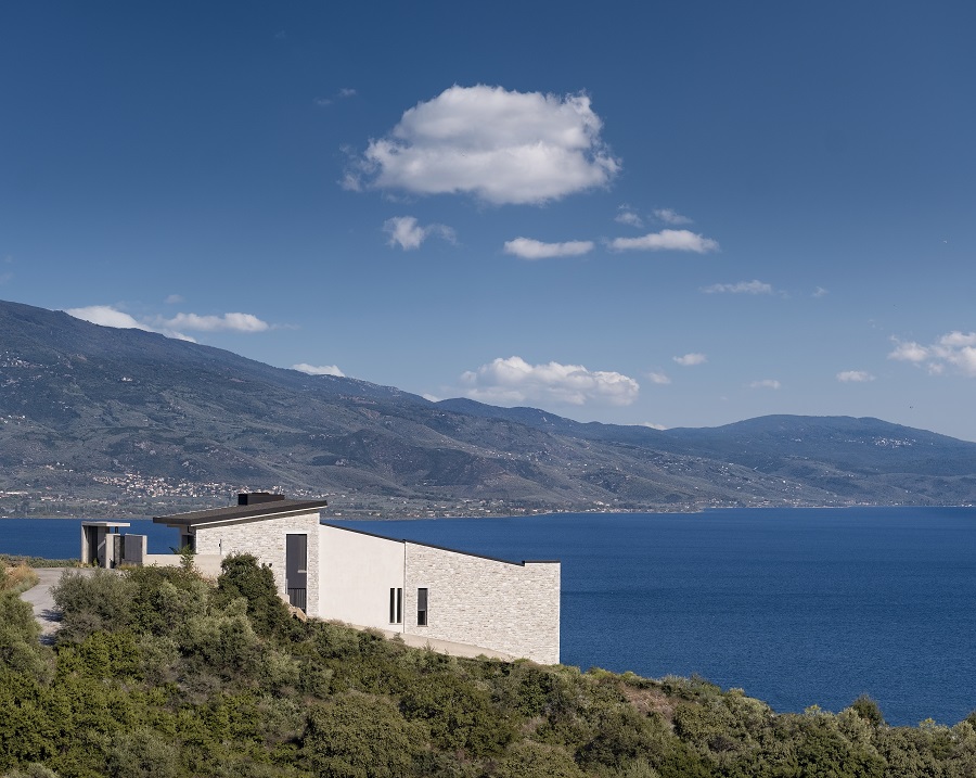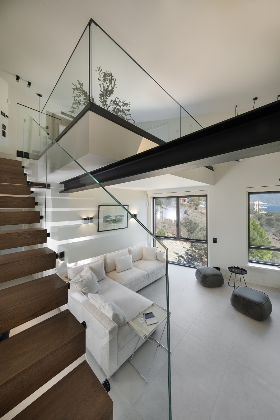 Η διαφορά των 10 μέτρων στην κλίση προς τη θέα του οικοπέδου, δημιούργησε την ανάγκη για ένα κάθετο τρισδιάστατο παζλ λειτουργιών, για μια κατοικία που η είσοδος της με τους χώρους διημέρευσης απέχουν 8 μέτρα καθ’ ύψος.