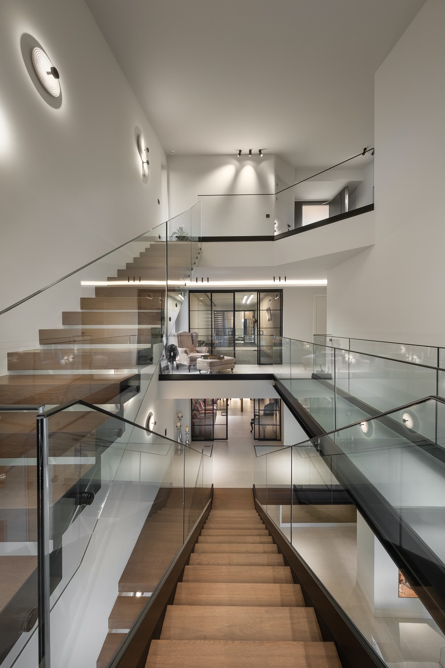 Μπαίνοντας στο κτήριο, στο εσωτερικό αίθριο, ξεδιπλώνεται η πολυδιάστατη σκάλα που ενώνει τους πολλαπλούς χώρους, δημιουργώντας μία αρμονική αίσθηση ροής. Η εσωτερική αυτή κλίμακα, μία ελαφριά μεταλλική κατασκευή με ξύλινα πατήματα, μαζί με τη γυάλινη γέφυρα, προσδίδουν την αίσθηση ανάλαφρης όσο και σταθερής σύνδεσης ανάμεσα στα επίπεδα, βοηθώντας το φυσικό αερισμό και τη διάχυση του εσωτερικού φωτός. Η κάθετη κίνηση στους χώρους εξυπηρετείται ωστόσο και από τον ανελκυστήρα.