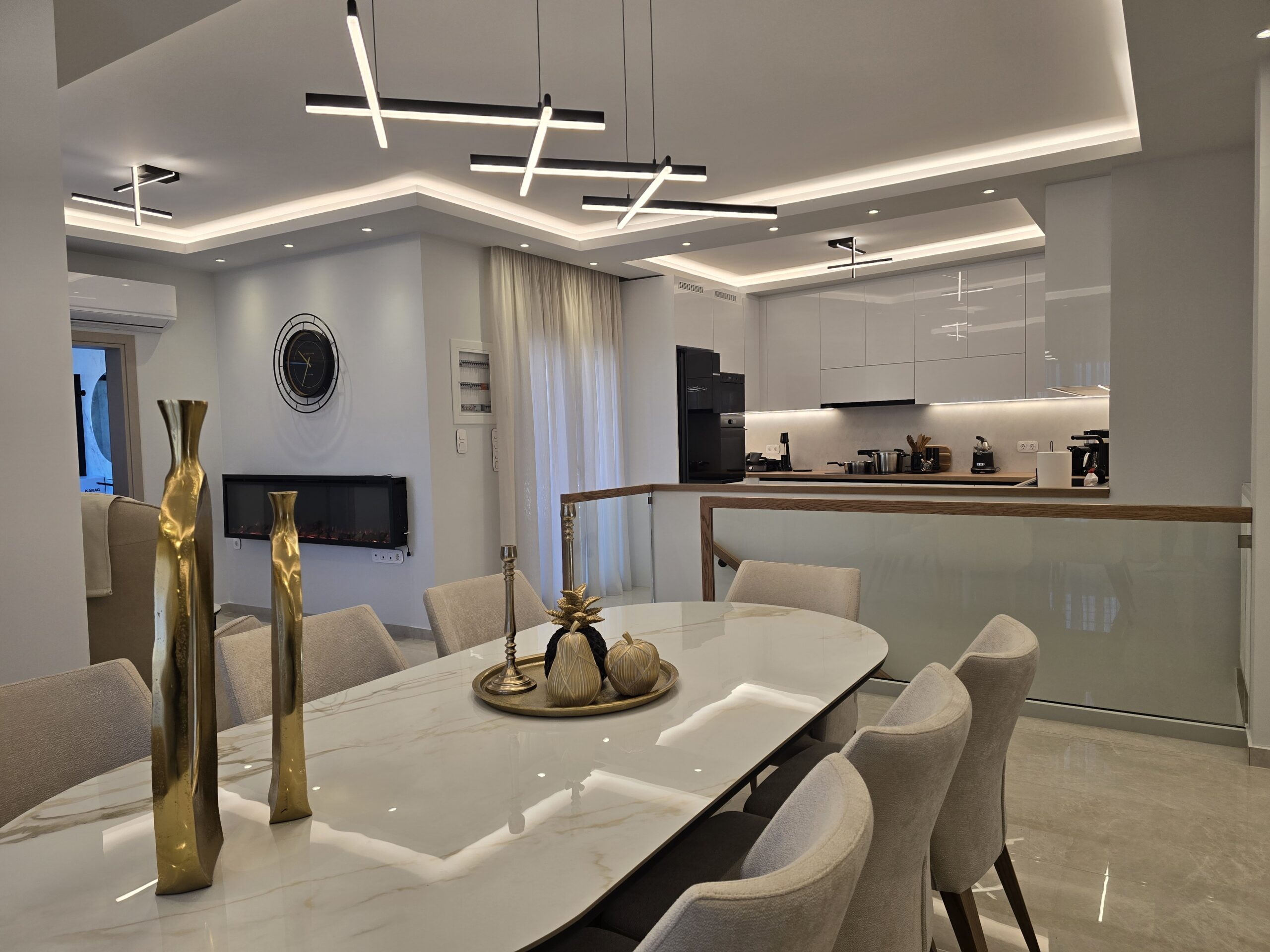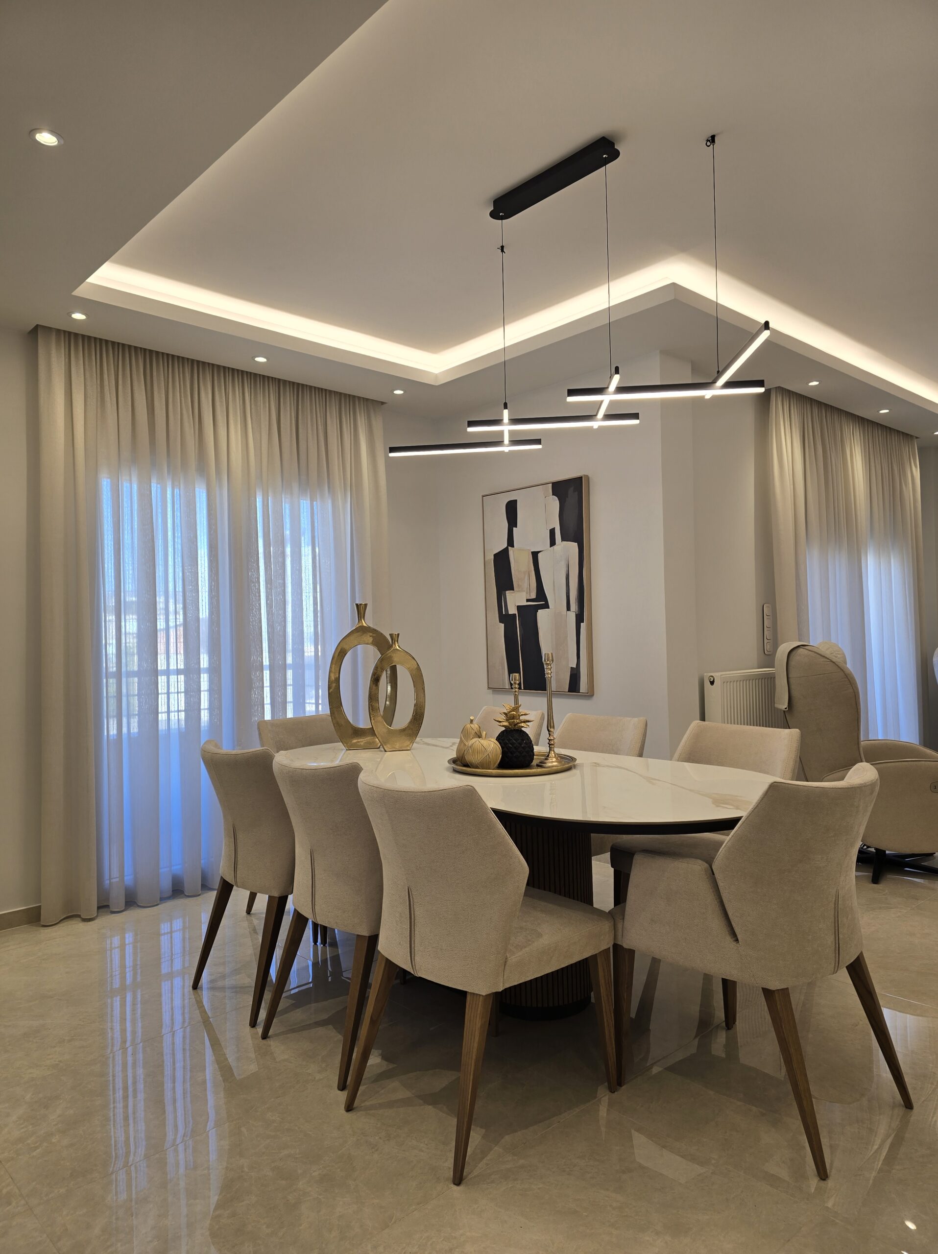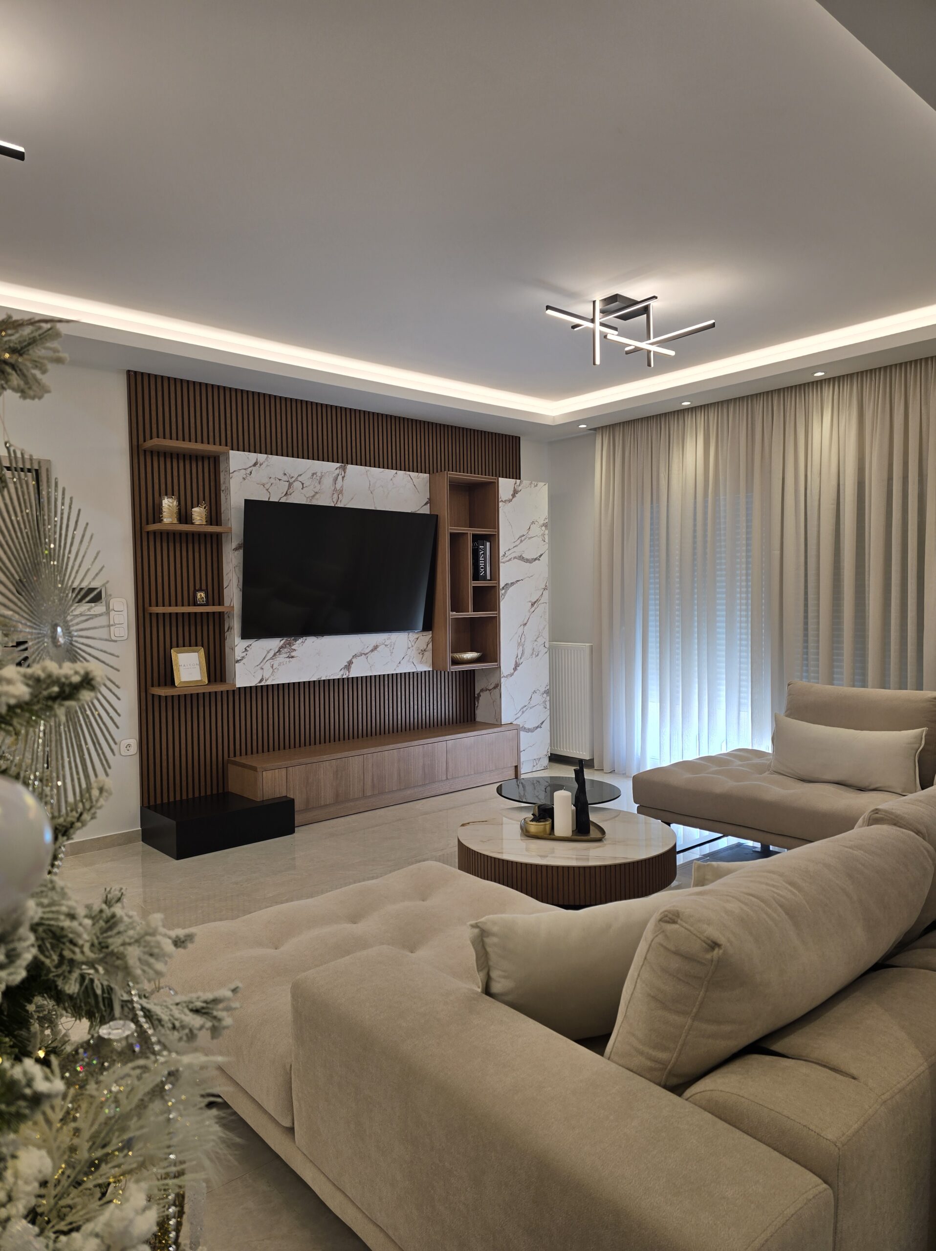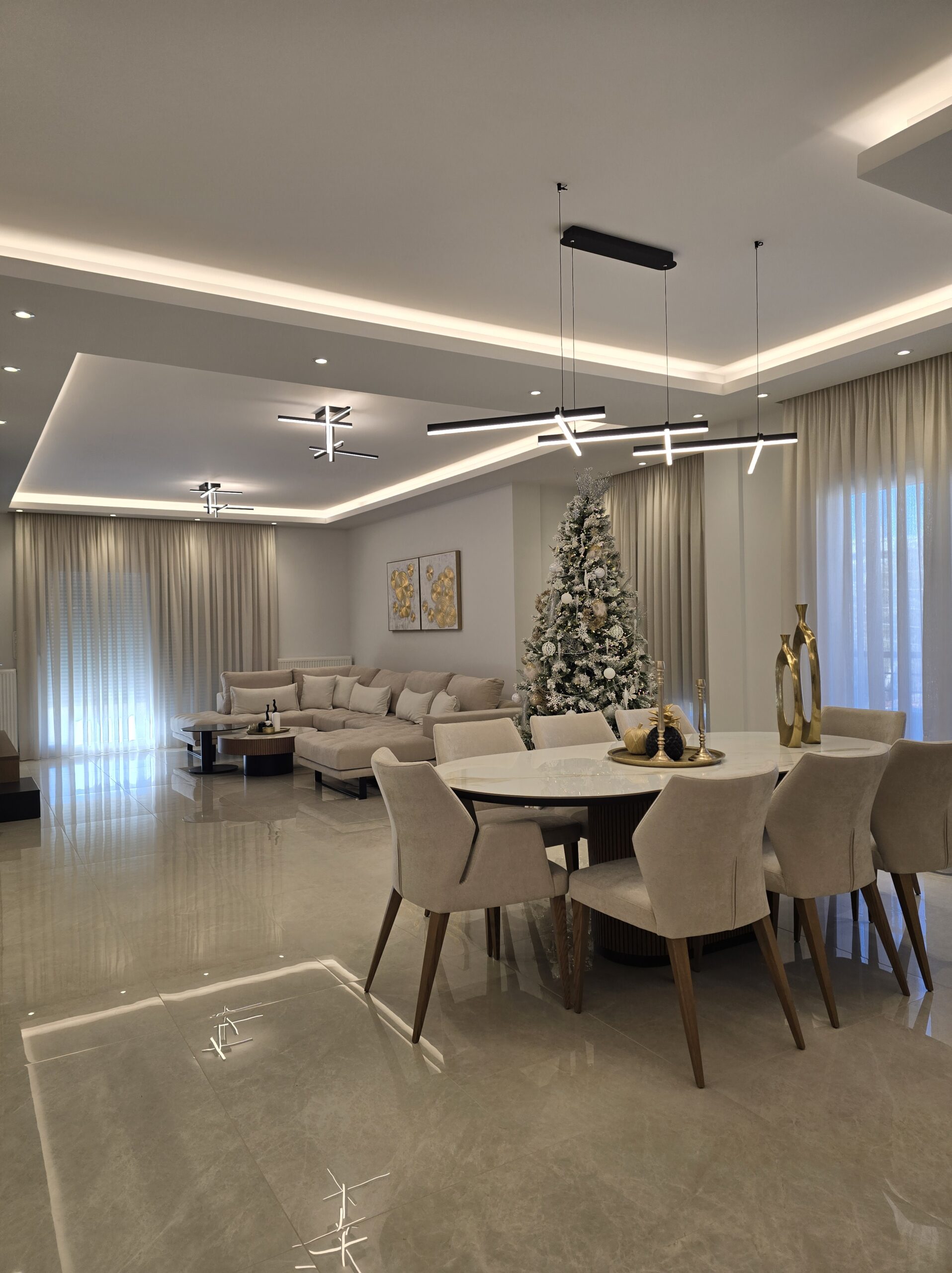 Πρόκειται για μία κατοικία όπου η ποιότητα, ο φωτισμός και η λεπτομέρεια συνεργάζονται ώστε να προσφέρουν στους Δημήτρη και Βίκυ ένα σπίτι φωτεινό, αρμονικό και απόλυτα προσαρμοσμένο στις σύγχρονες ανάγκες μιας πολυτελούς καθημερινότητας.