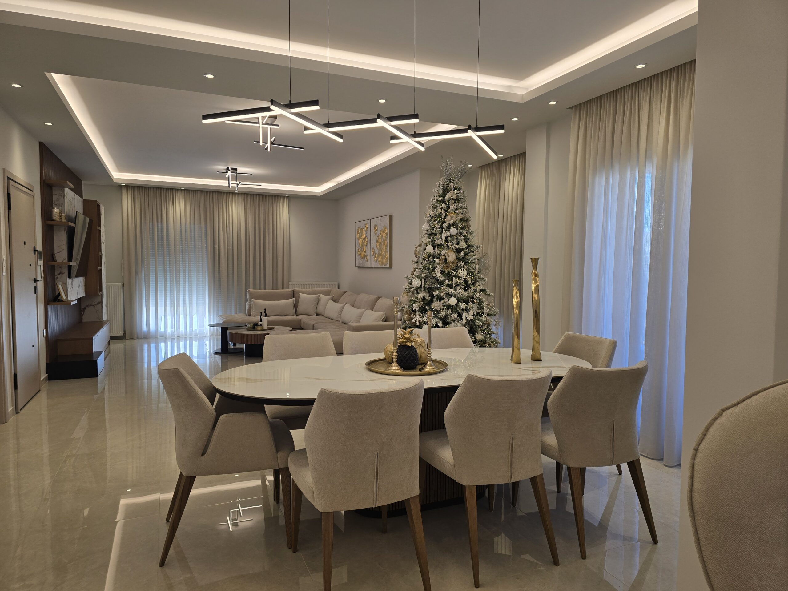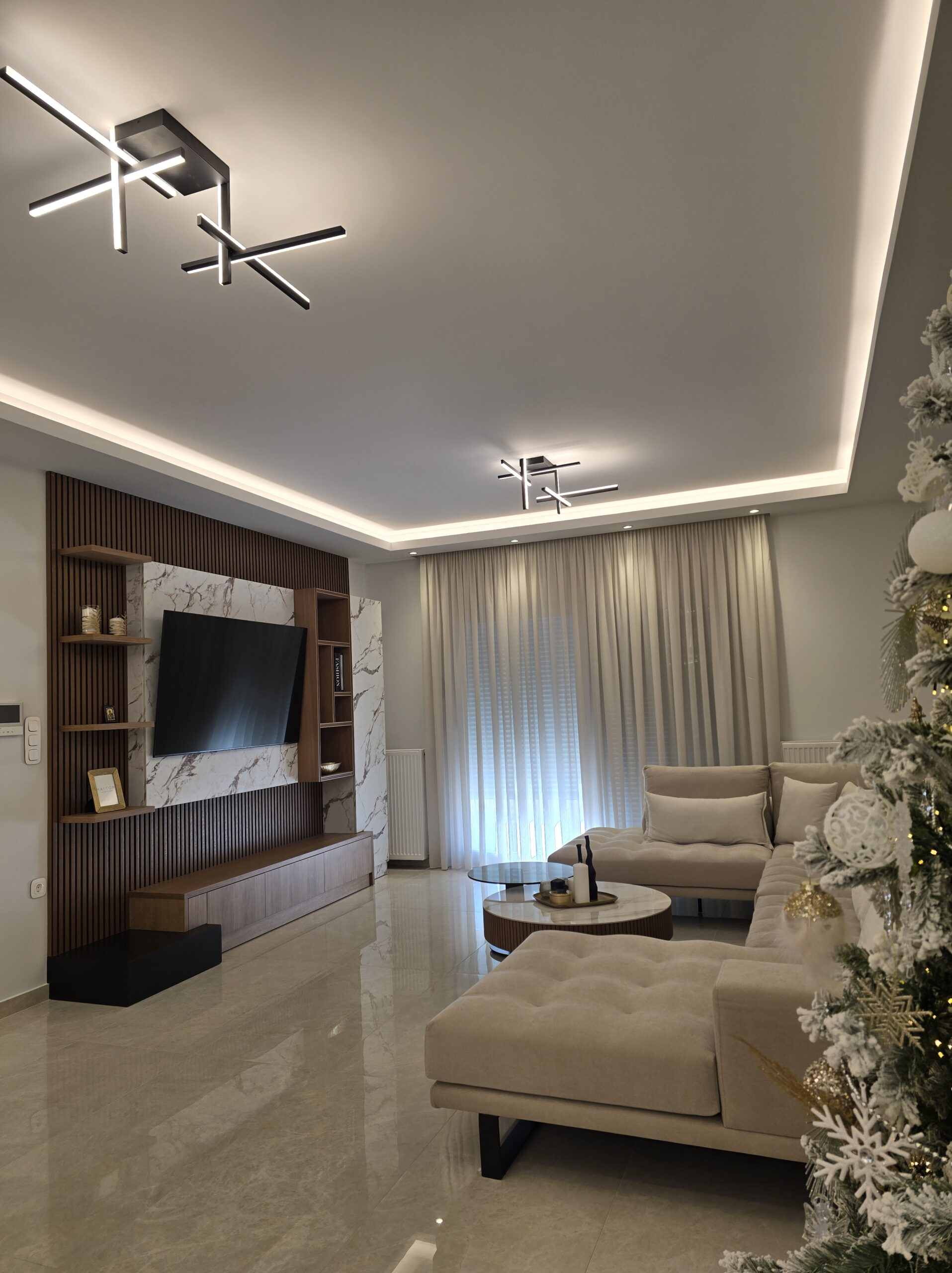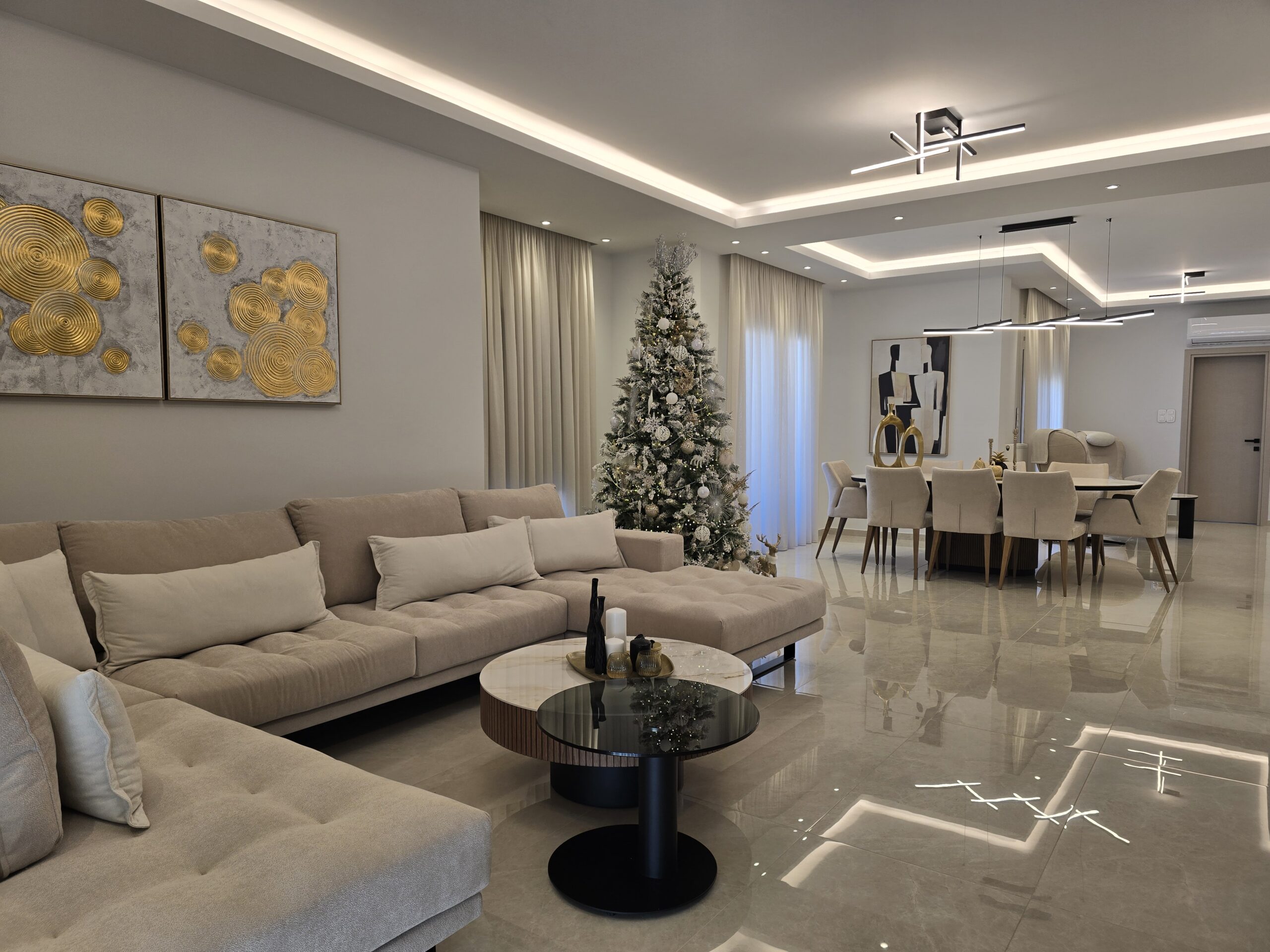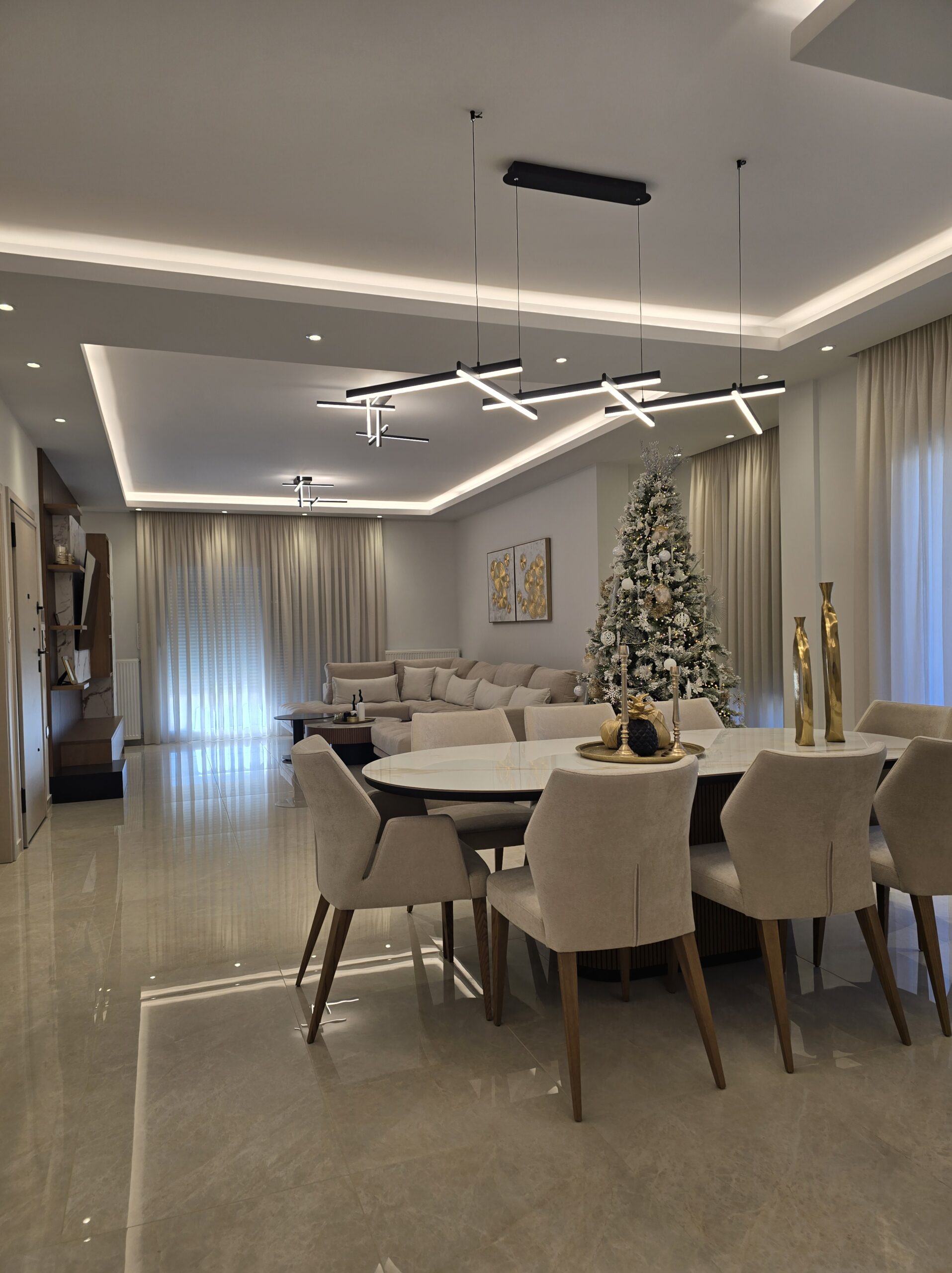 Πρόκειται για μία κατοικία όπου η ποιότητα, ο φωτισμός και η λεπτομέρεια συνεργάζονται ώστε να προσφέρουν στους Δημήτρη και Βίκυ ένα σπίτι φωτεινό, αρμονικό και απόλυτα προσαρμοσμένο στις σύγχρονες ανάγκες μιας πολυτελούς καθημερινότητας.