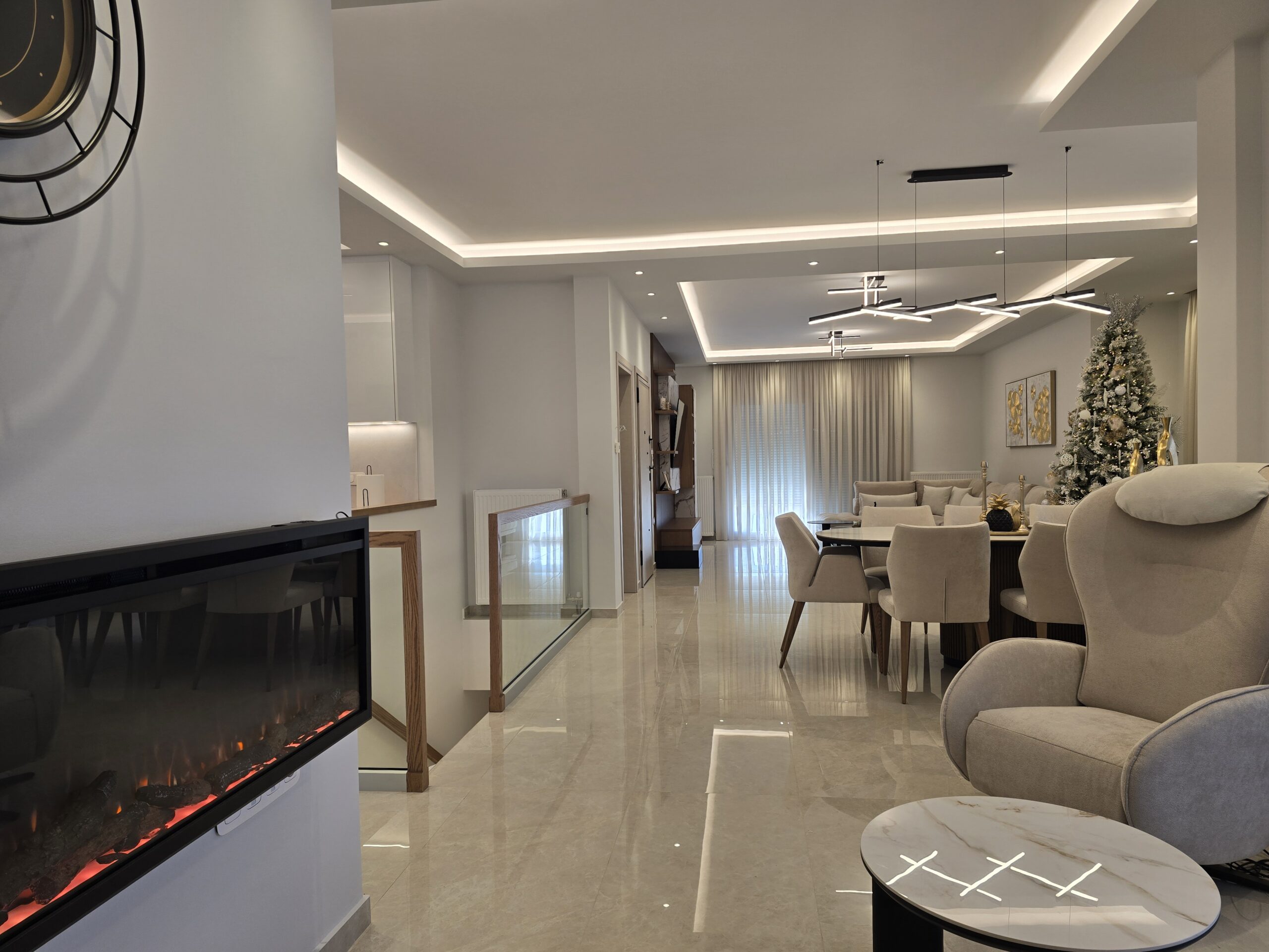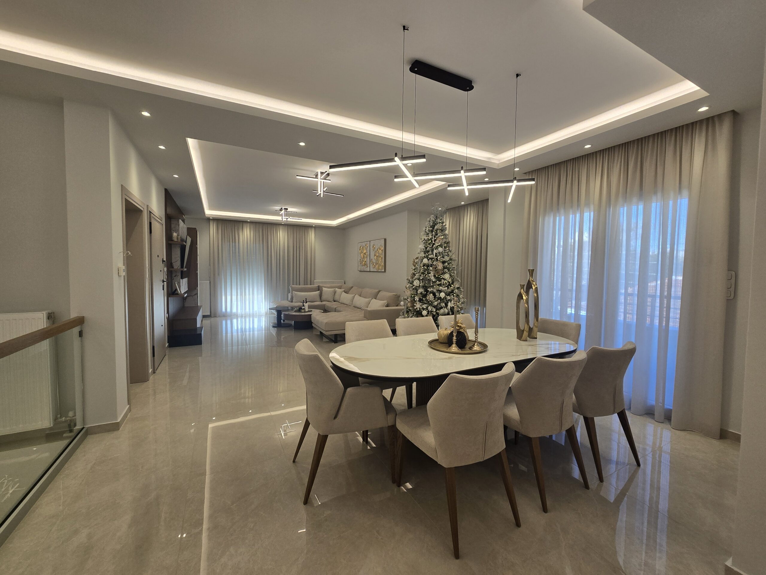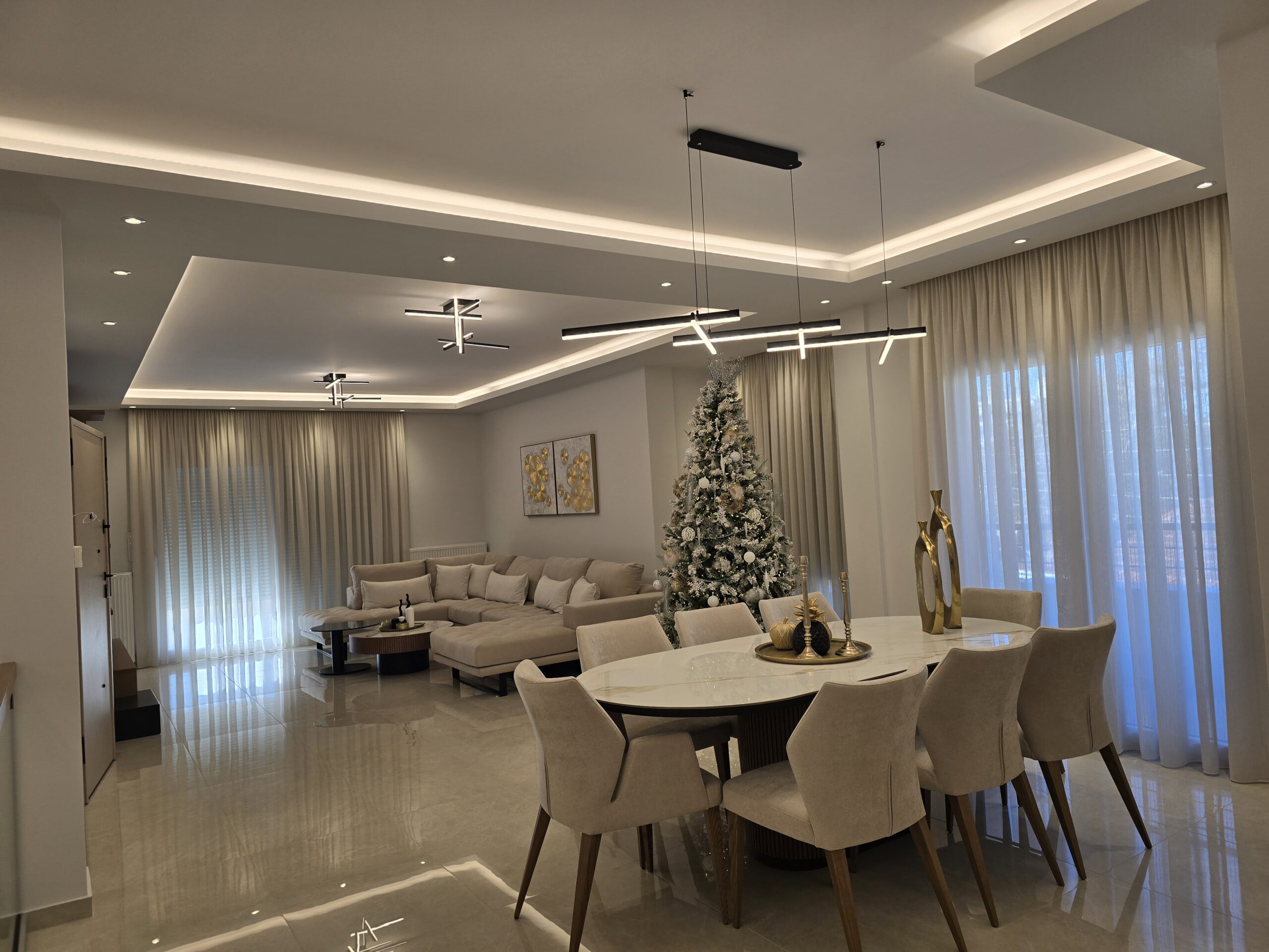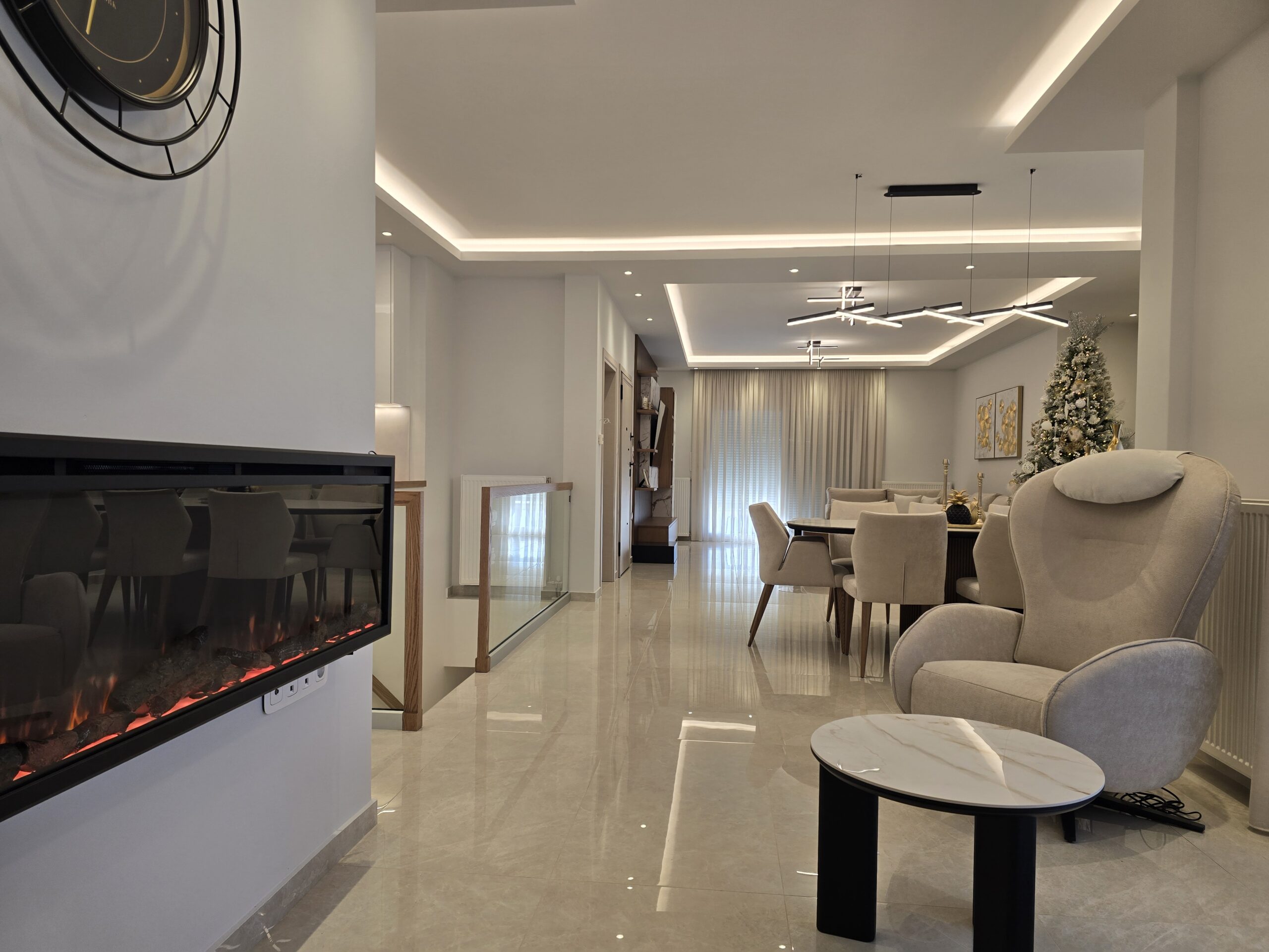 Πρόκειται για μία κατοικία όπου η ποιότητα, ο φωτισμός και η λεπτομέρεια συνεργάζονται ώστε να προσφέρουν στους Δημήτρη και Βίκυ ένα σπίτι φωτεινό, αρμονικό και απόλυτα προσαρμοσμένο στις σύγχρονες ανάγκες μιας πολυτελούς καθημερινότητας.