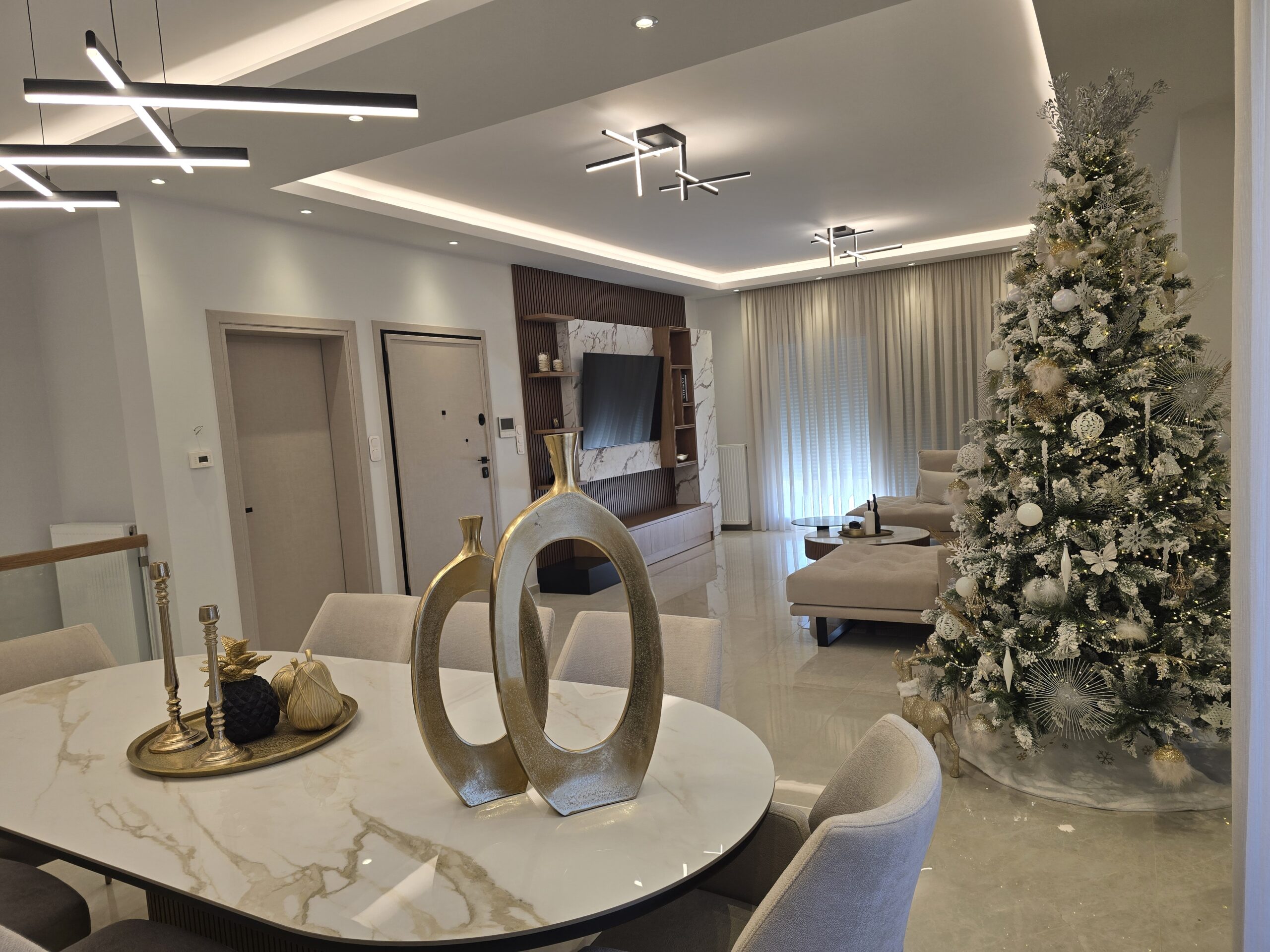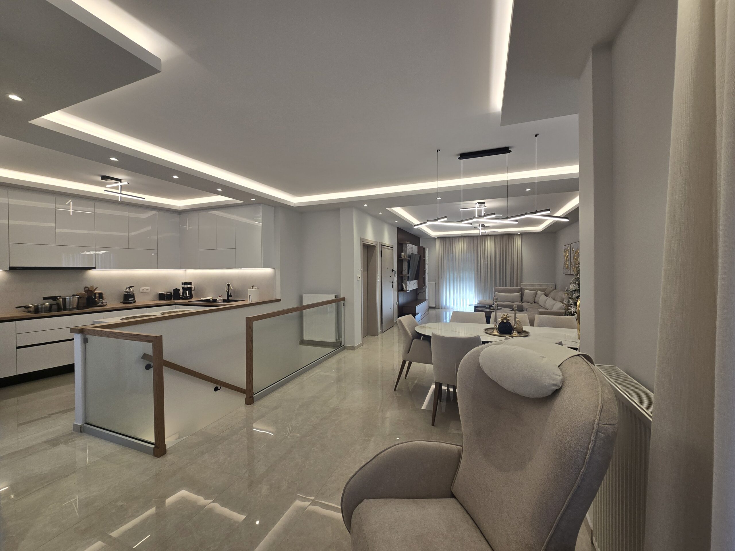 Μια σύγχρονη πολυτελής κατοικία στους Αγίους Αναργύρους, σχεδιασμένη για να αποπνέει ηρεμία και διαχρονική κομψότητα, υποδέχεται τον επισκέπτη με τη φωτεινότητά της και τις μπεζ–λευκές αποχρώσεις που κυριαρχούν σε όλους τους χώρους.