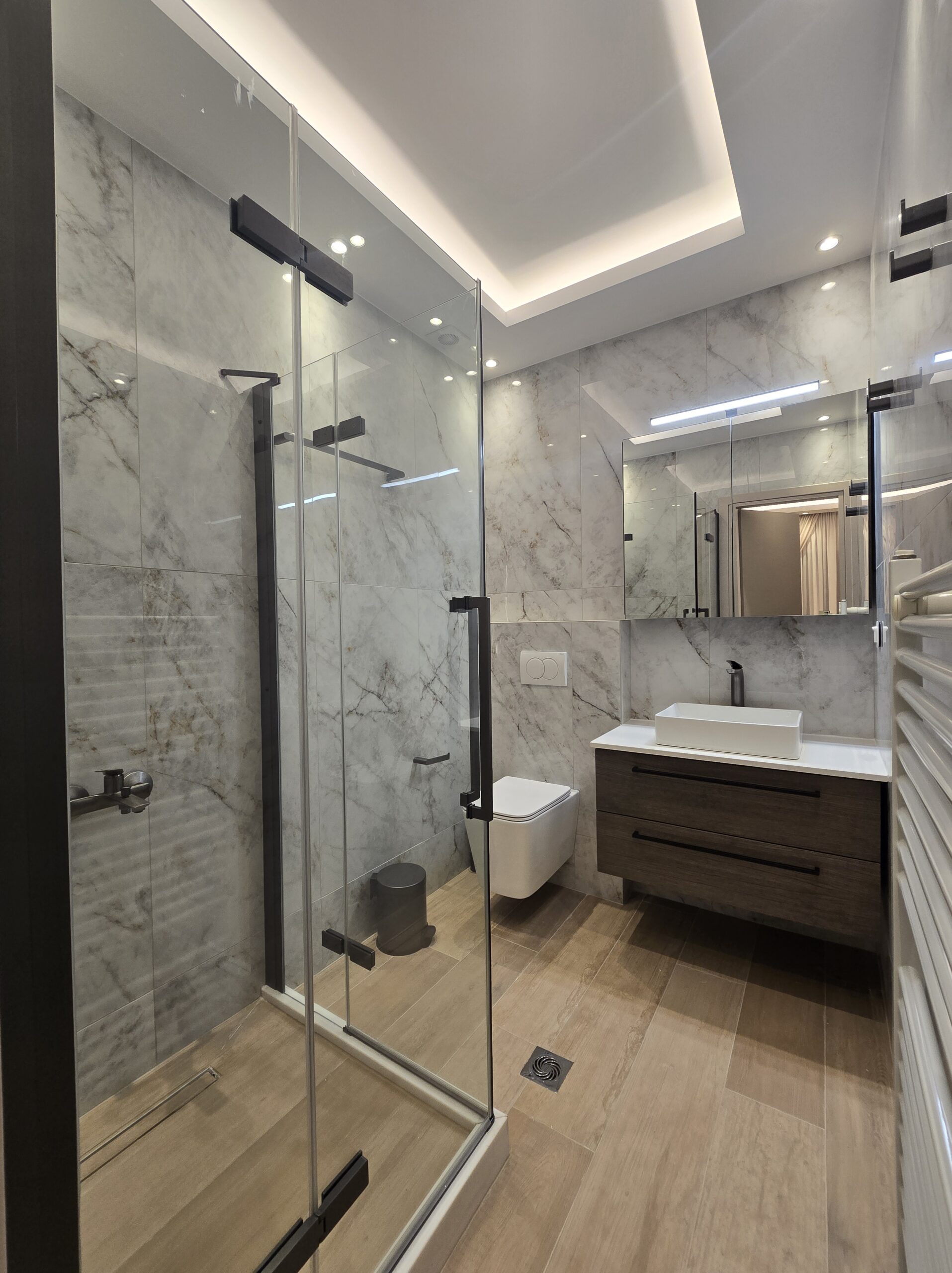 Το μπάνιο ολοκληρώνει την εμπειρία με έναν συνδυασμό ιδιαίτερων υλικών: γρανιτοπλακάκια μαρμάρου στους τοίχους και γρανιτοπλακάκια ξύλου στο δάπεδο. Η αντίθεση του μαρμάρου με την υφή του ξύλου δημιουργεί ένα περιβάλλον spa, που εντυπωσιάζει τόσο αισθητικά, όσο και λειτουργικά.