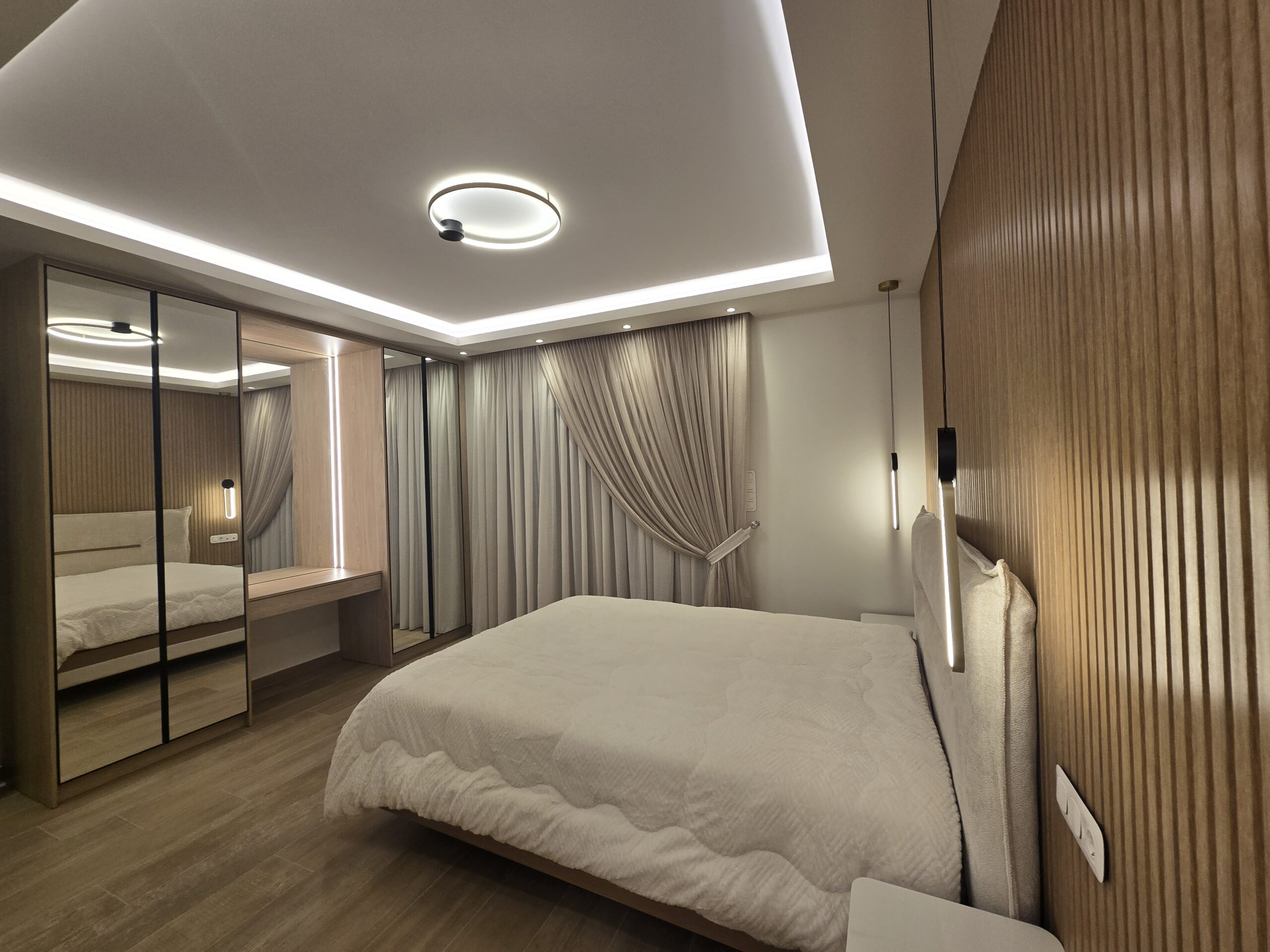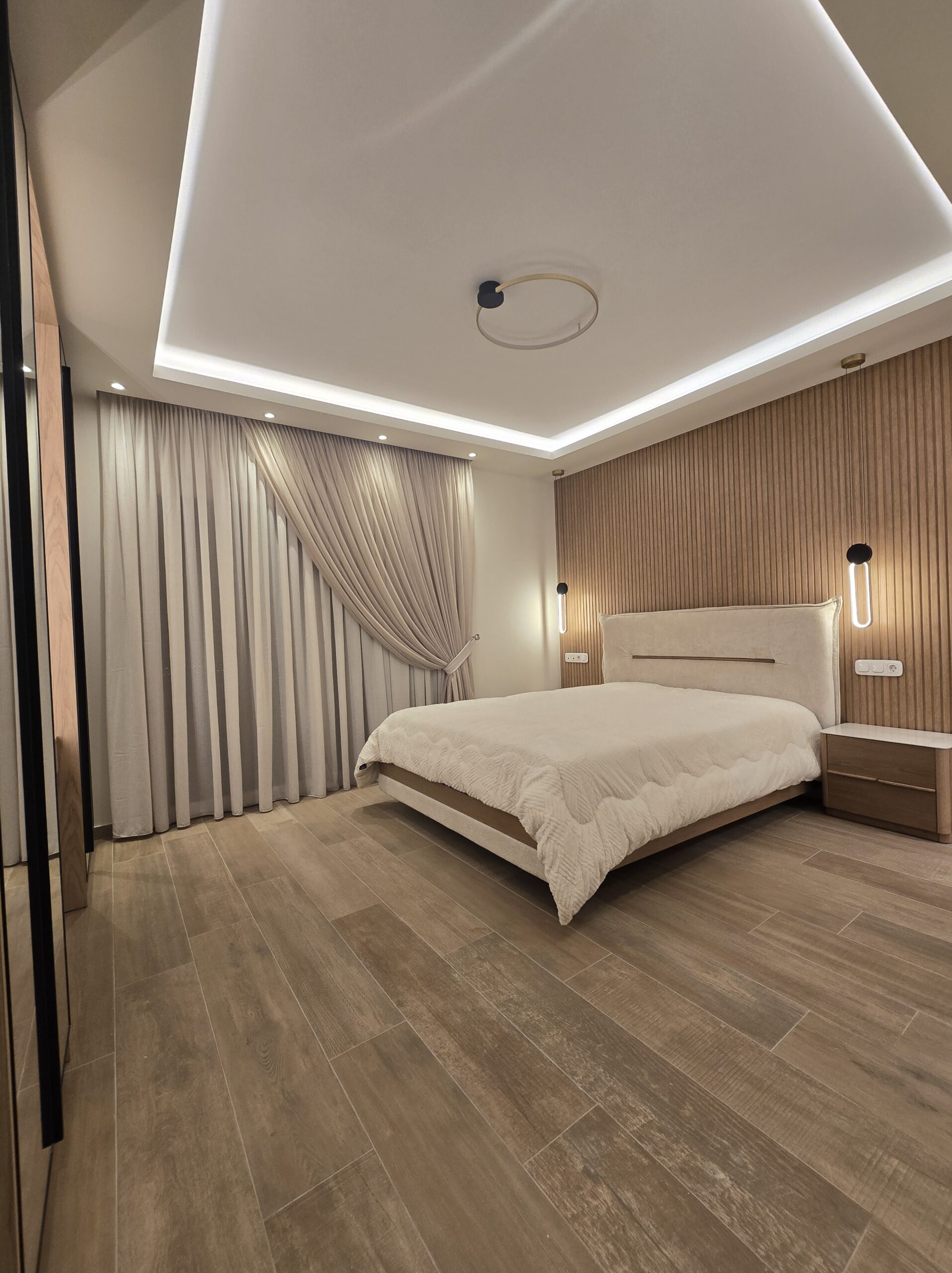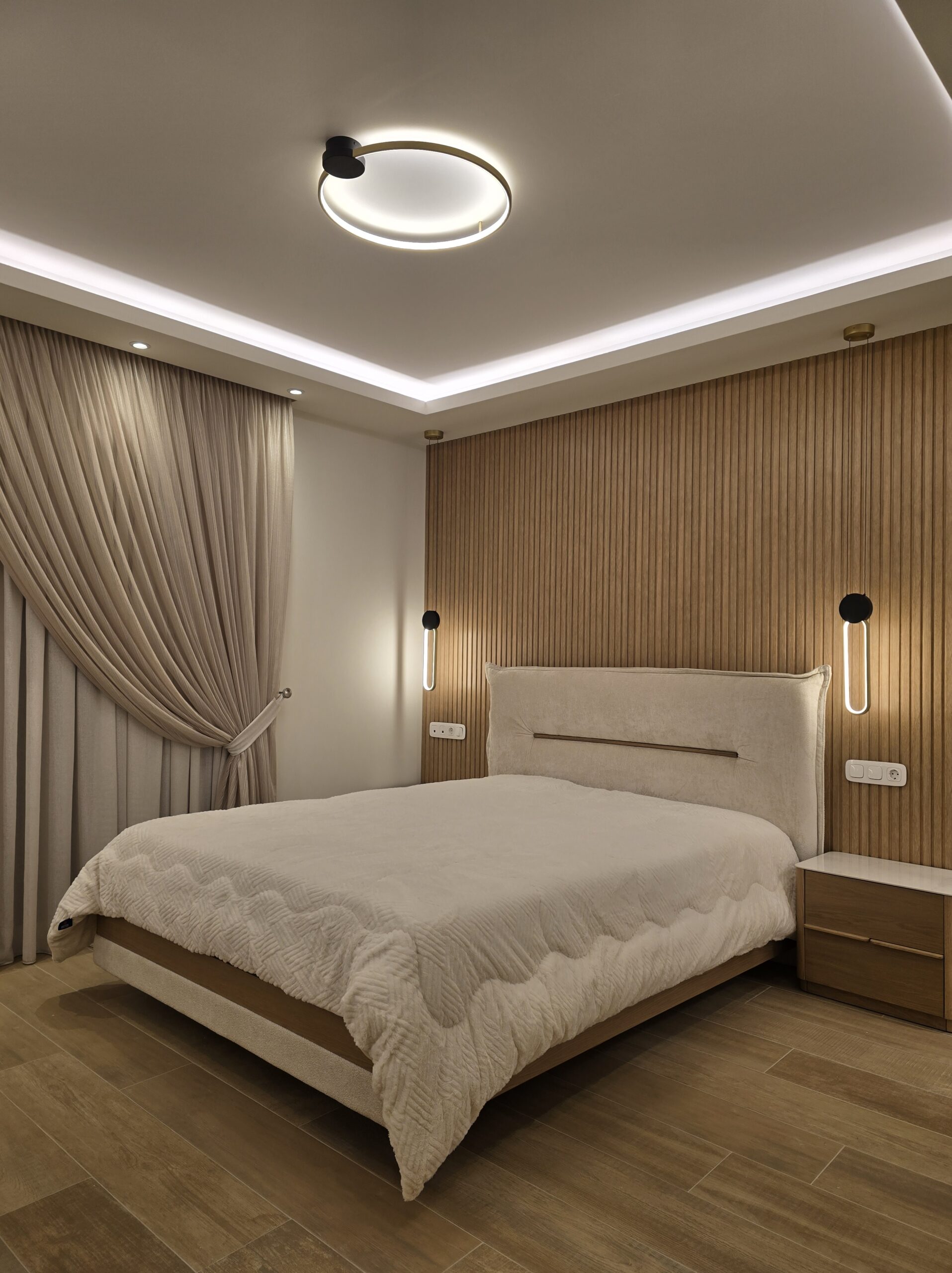 Στην κύρια κρεβατοκάμαρα -masterbedroom-, οι ξύλινες υφές δίνουν χαρακτήρα και θερμότητα, ενώ ο πλούσιος φωτισμός — τόσο ο έμμεσος όσο και ο στοχευμένος — δημιουργεί μια ατμόσφαιρα χαλάρωσης, ιδανική για στιγμές προσωπικής ηρεμίας. Οι μπεζ και λευκές αποχρώσεις συνεχίζουν και εδώ, προσφέροντας συνοχή και μια αίσθηση αυθεντικής πολυτέλειας.
