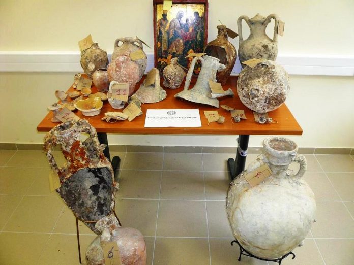Σύμφωνα με την Αστυνομία, μετά από κατάλληλη αξιοποίηση στοιχείων για κατοχή και απόκρυψη αρχαίων αντικειμένων από το δράστη, διενεργήθηκαν νομότυπες έρευνες στο σπίτι, αλλά και σε αποθήκη, ιδιοκτησίας του, κατά τις οποίες βρέθηκαν και κατασχέθηκαν συνολικά 23 τεμάχια αμφορέων και αγγείων, 9 αμφορείς και μία βυζαντινή εικόνα, τα οποία εμπίπτουν στη νομοθεσία περί αρχαιοτήτων.