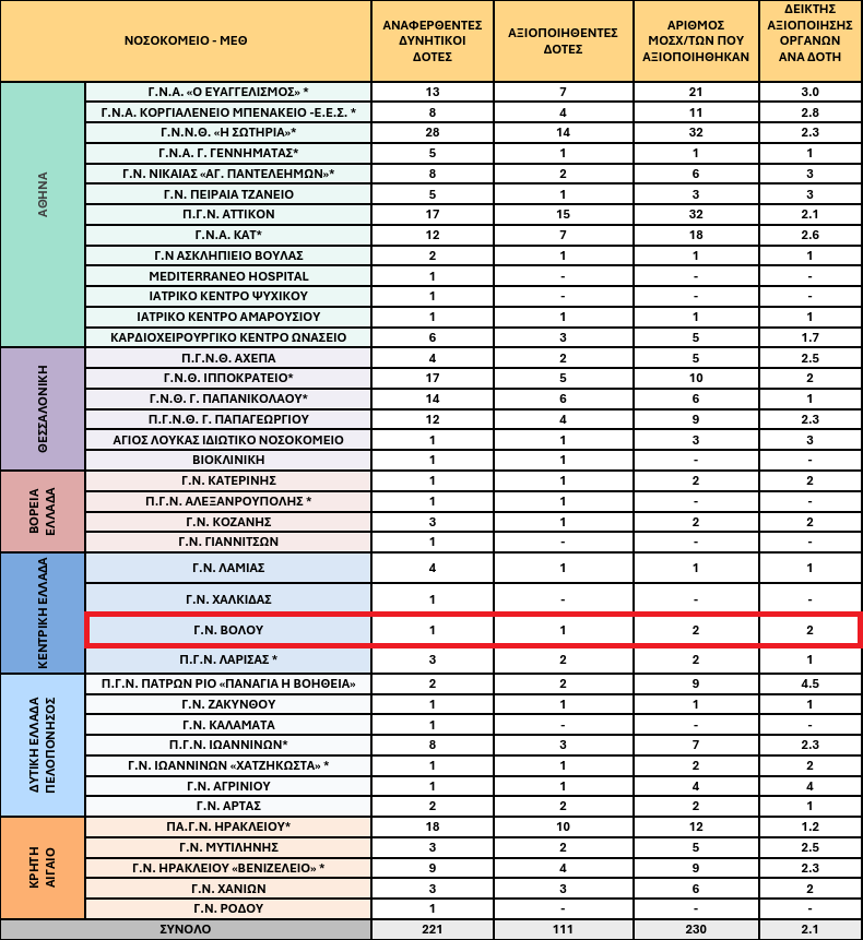 Στον απολογισμό αναφέρεται όμως και το αποτύπωμα των Νοσοκομείων σε όλη την χώρα, με το Νοσοκομείο του Βόλου να έχει ακόμη πολύ μικρό. Ειδικότερα, σύμφωνα με τα στοιχεία του ΕΟΜ για το 2024, μόλις ένας ασθενής αναφέρθηκε ως δυνητικός δότης, δηλαδή με διαγνωσμένο εγκεφαλικό θάνατο ή βασικά σημεία εγκεφαλικού θανάτου, ενώ μόλις ένας έγινε δότης, με τον αριθμό των μοσχευμάτων που δόθηκαν να είναι δύο.