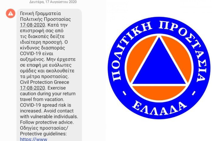 «Γενική Γραμματεία Πολιτικής Προστασίας 17-08-2020. Κατά την επιστροφή σας από τις διακοπές δείξτε ιδιαίτερη προσοχή. Ο κίνδυνος διασποράς COVID 19 είναι αυξημένος. Μην έρχεστε σε επαφή με ευάλωτες ομάδες και ακολουθείστε τα μέτρα προστασίας”.